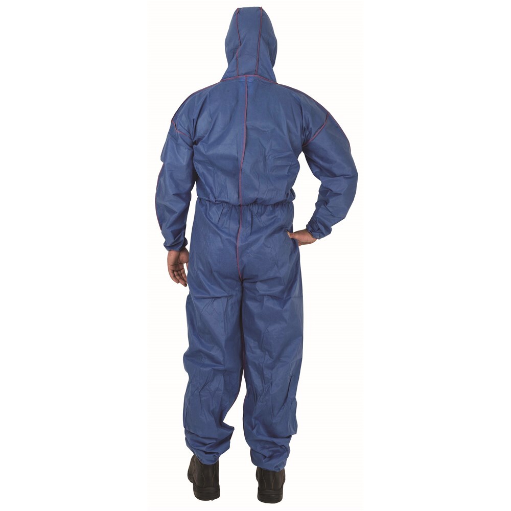 One-piece coverall made of non-woven 55 gsm SMS with 4-thread overlocked seams, comfortable hood, zip front opening and covered by a self-adhesive flap, elastic at cuffs, ankles, hood and waist.