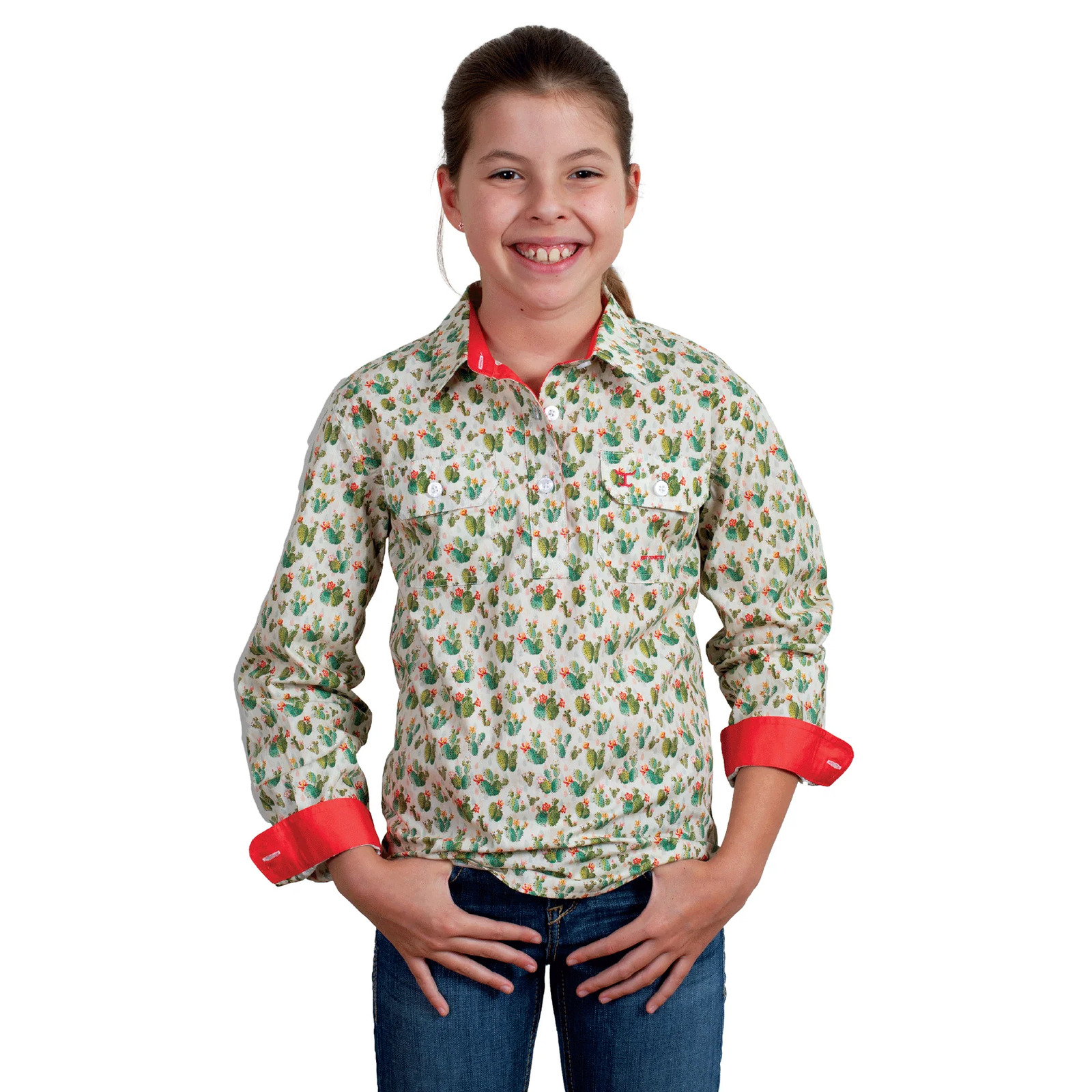 Just Country Girls Harper Half Button Print Shirt (GWLS2411) Cream Cactus M/8-9 [GD]