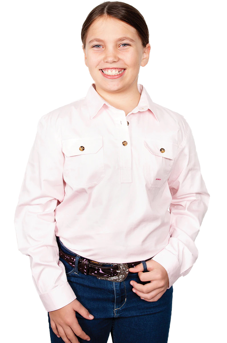 Well, now the kids can have the same style as the big girls! The Kenzie Half Button Work Shirt is crafted in 100% light-weight cotton fabric. It's the perfect shirt for kids on the land.