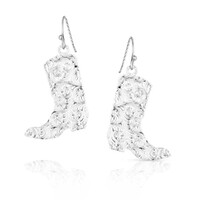 Wear these stunning earrings for a fun and bold Western look. The bright silver tone earrings are a silhouette of a cowboy boot that dangles from hypoallergenic French wires. Bright cut engraving covers the center of the bright silver tone boot. A chiseled edge adds to the design and complements the piece.
