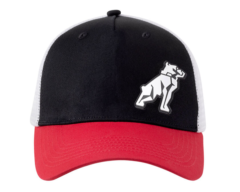 The Mack Tri-Coloured Curved Trucker Cap features a rubber Mack Bulldog logo on the front, a contrasting red brim, and a white mesh back. The perfect combination of shade and ventilation!