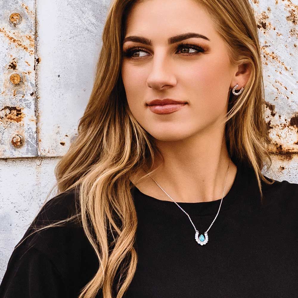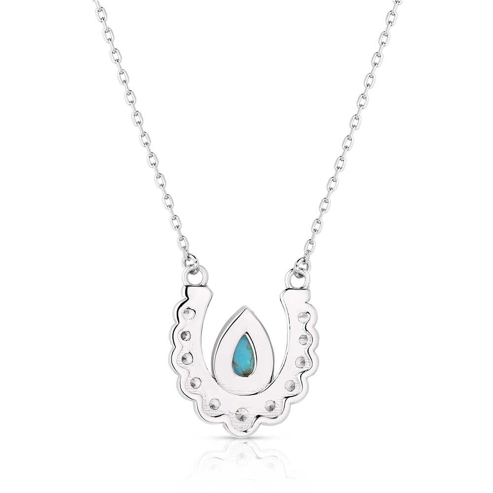 The Crystal Trot Necklace is the perfect combination of turquoise and sparkle. The pendant has a scalloped edge providing a unique element to the design. Clear cubic zirconia crystals run through the middle of the horseshoe pendant. In the center is a turquoise stone in a teardrop shape to complete the design. This necklace has a 19 inch adjustable chain.