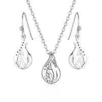 Montana Silversmith's Whisps of Elegance Crystal Jewellery Set is exactly that - elegant. The encompassing teardrop shape is in a bright silver tone with an open center. Delicate scrolls in a contrasting rose gold finish curl through the center of the design. Additional sparkle is achieved with small clear cubic zirconia crystals down one side of the teardrop. The earrings are suspended from hypoallergenic French wires, and the necklace from a 19 inch silver tone adjustable chain.