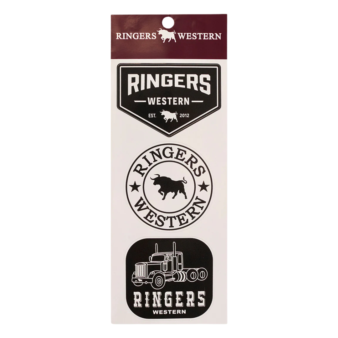 3 Pack of Ringers Western stickers. This pack features vinyl stickers showcasing three different logos: Jett, Classic Ringers Round & Long Haul logos.