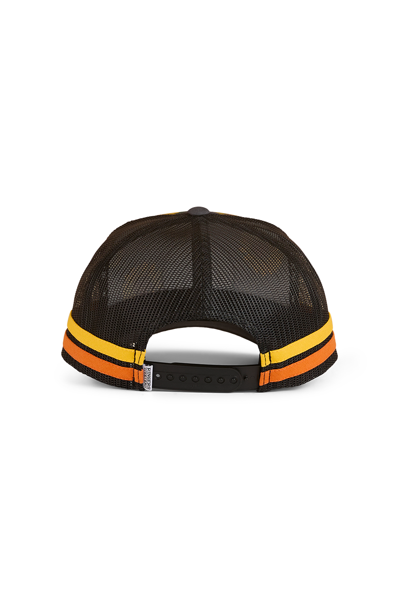 The Sunflowers kids trucker cap is both practical and playful, the ultimate combo for summer time. Created from polyester twill fabric and featuring a mesh back, this cheerful trucker cap will keep little heads cool and comfortable whilst offering durability. The mid profile design suits a variety of head sizes, whilst the adjustable snapback allows for a completely customisable fit. The summery sunflower design is complemented by twill side stripes, whilst a Ringers Western badge finishes this cap off in true Ringers Western style.