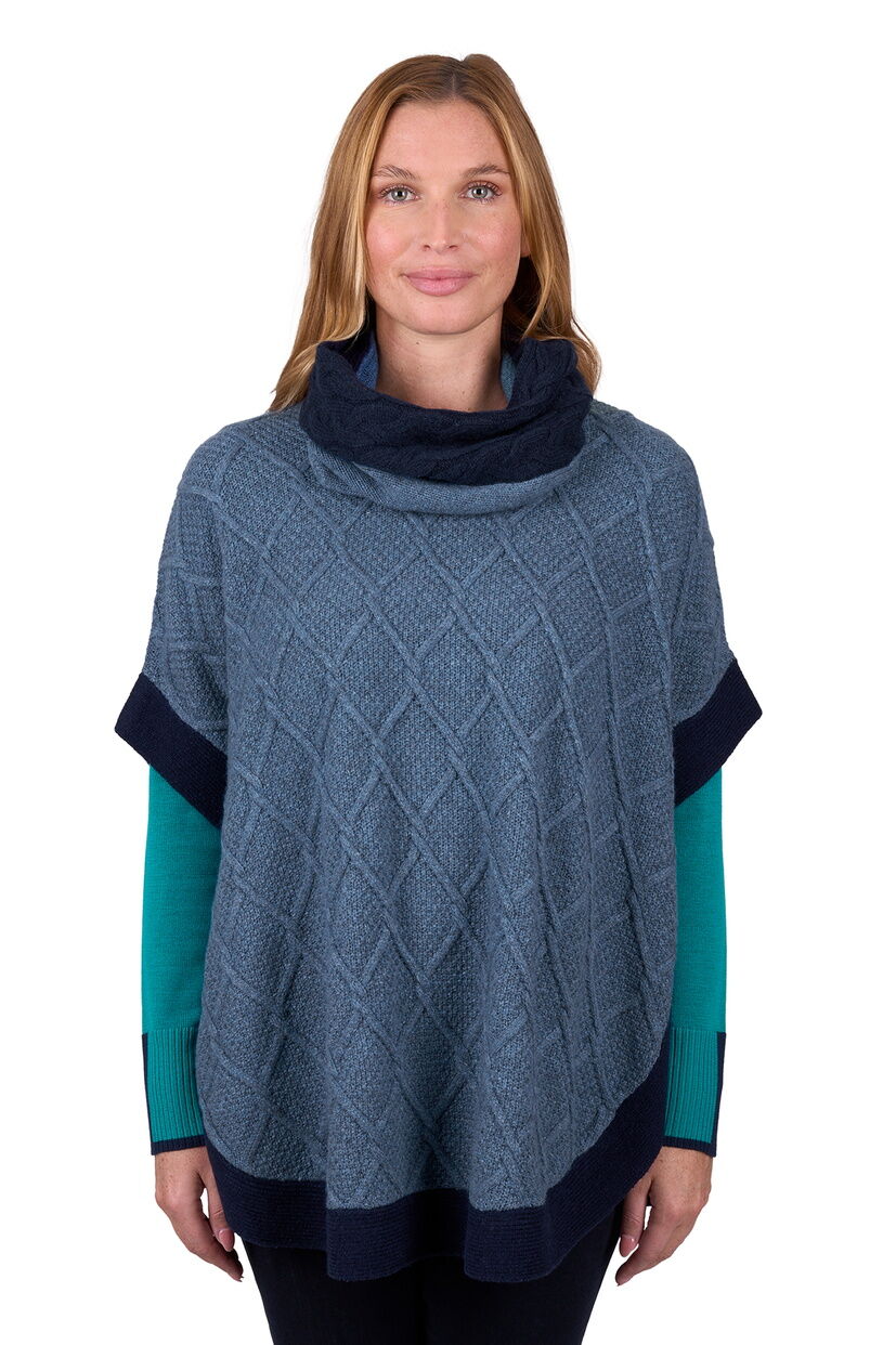 ✔ Midweight fully fashioned knit poncho in unique cable design