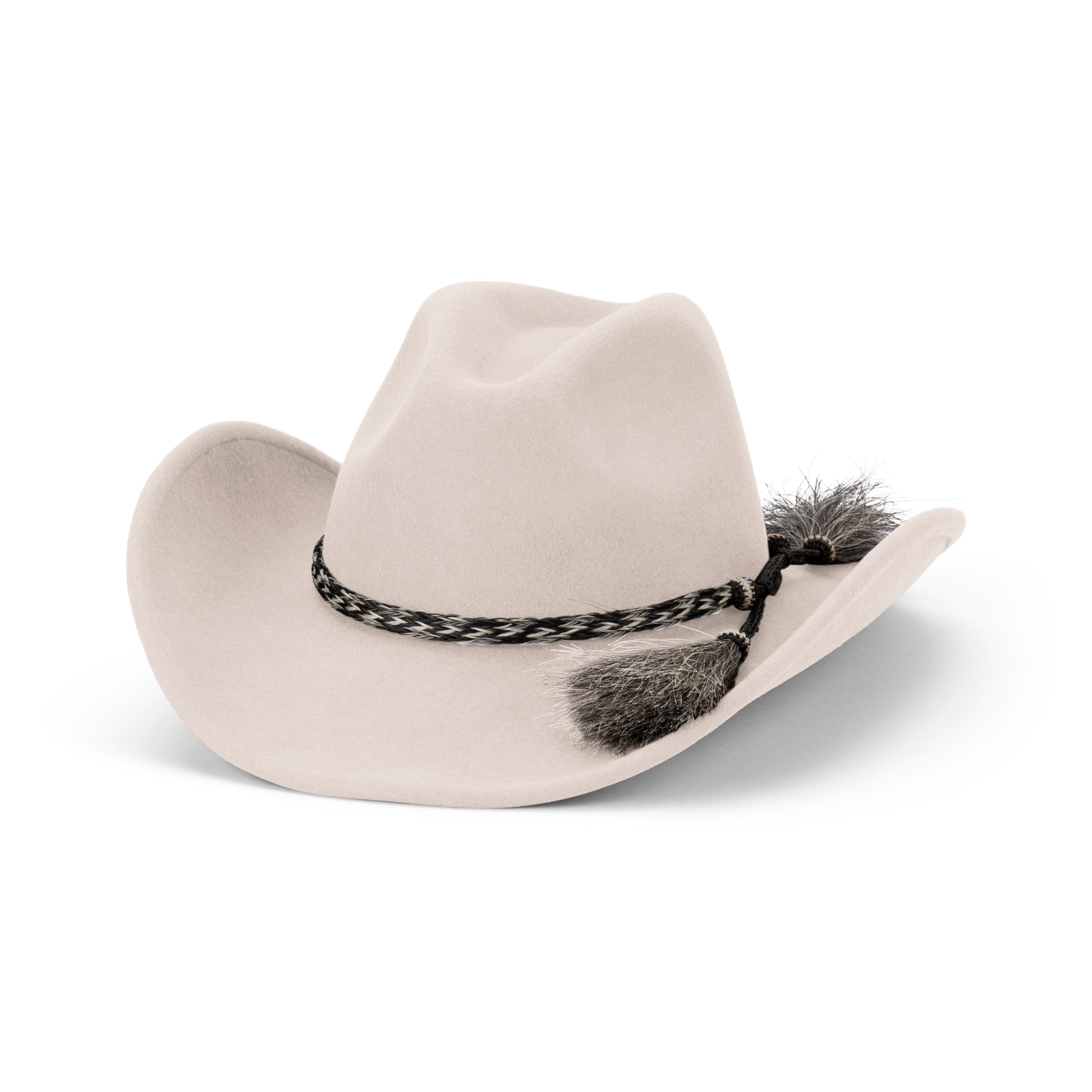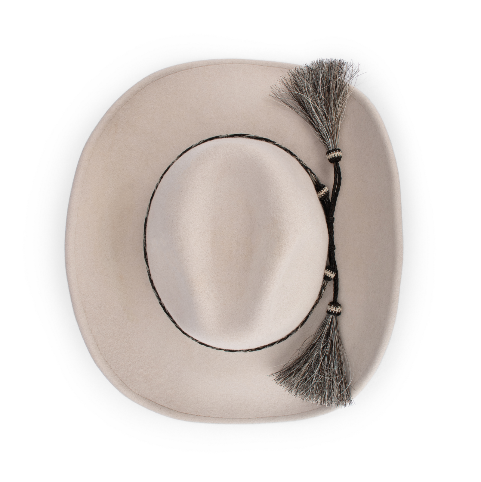 The children's Wrangler Hat is made from Australian wool felt. Wool felt is ideal for hats. It holds it's shape, sheds light rain, and is durable and wearable. This dense, soft felt is formed by matting wool fibres together with the application of heat, moisture, and pressure. Then the felt is moulded over a hat block to shape the crown and brim. For The Wrangler, the crown is shaped to a 9 cm height, and the brim is set at a 9 cm width. These dimensions give a classic western silhouette. The hat is then trimmed and finished with a horsehair hatband. The Wrangler is also designed for life on the go. It's a hat that’s packable and bounces back after being crushed or stored in a bag - ideal for kids who are always on the move. The craftsmanship aims to balance durability with a kid-friendly fit for hours of outdoor activity.