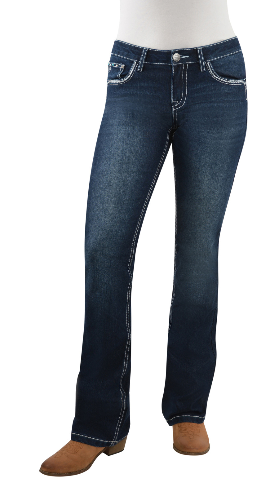 - Feature embroidery on back pockets and front scoop pockets