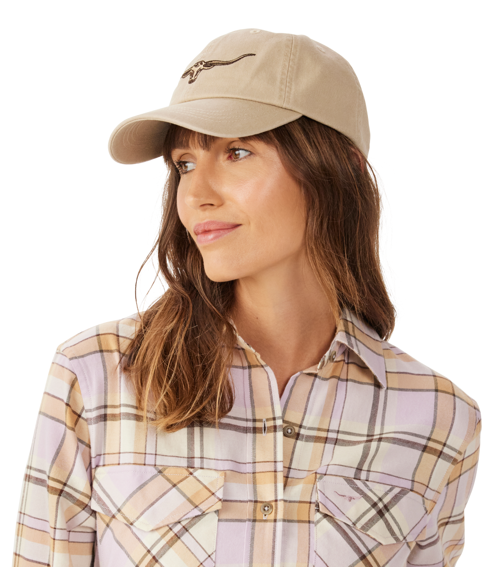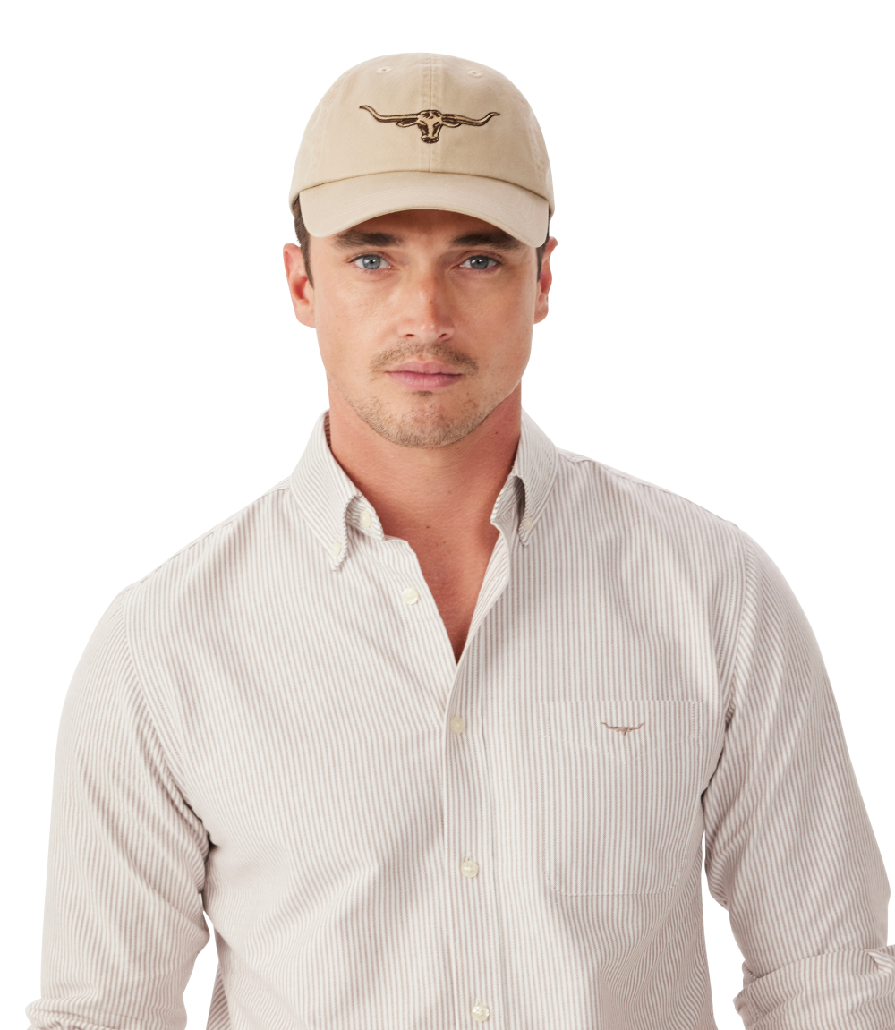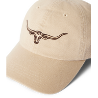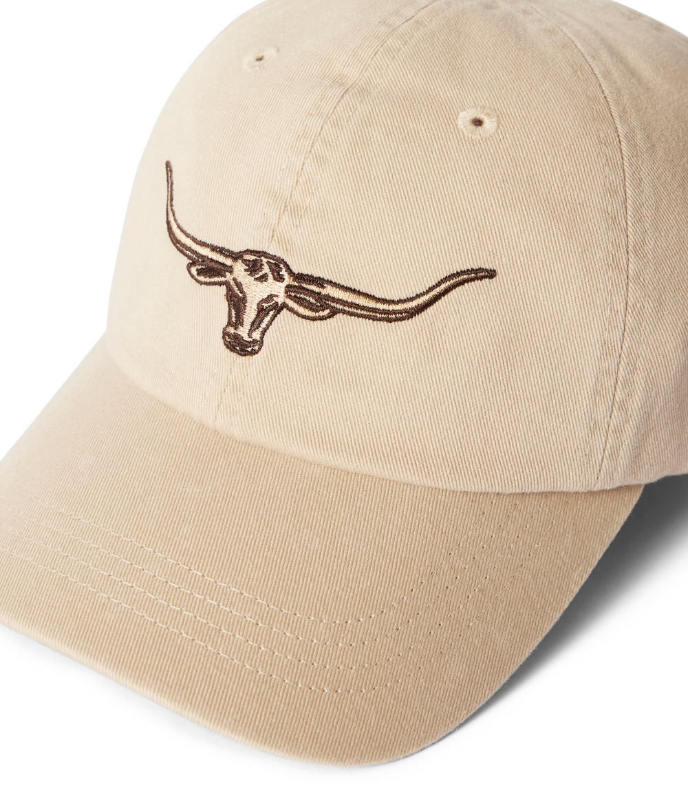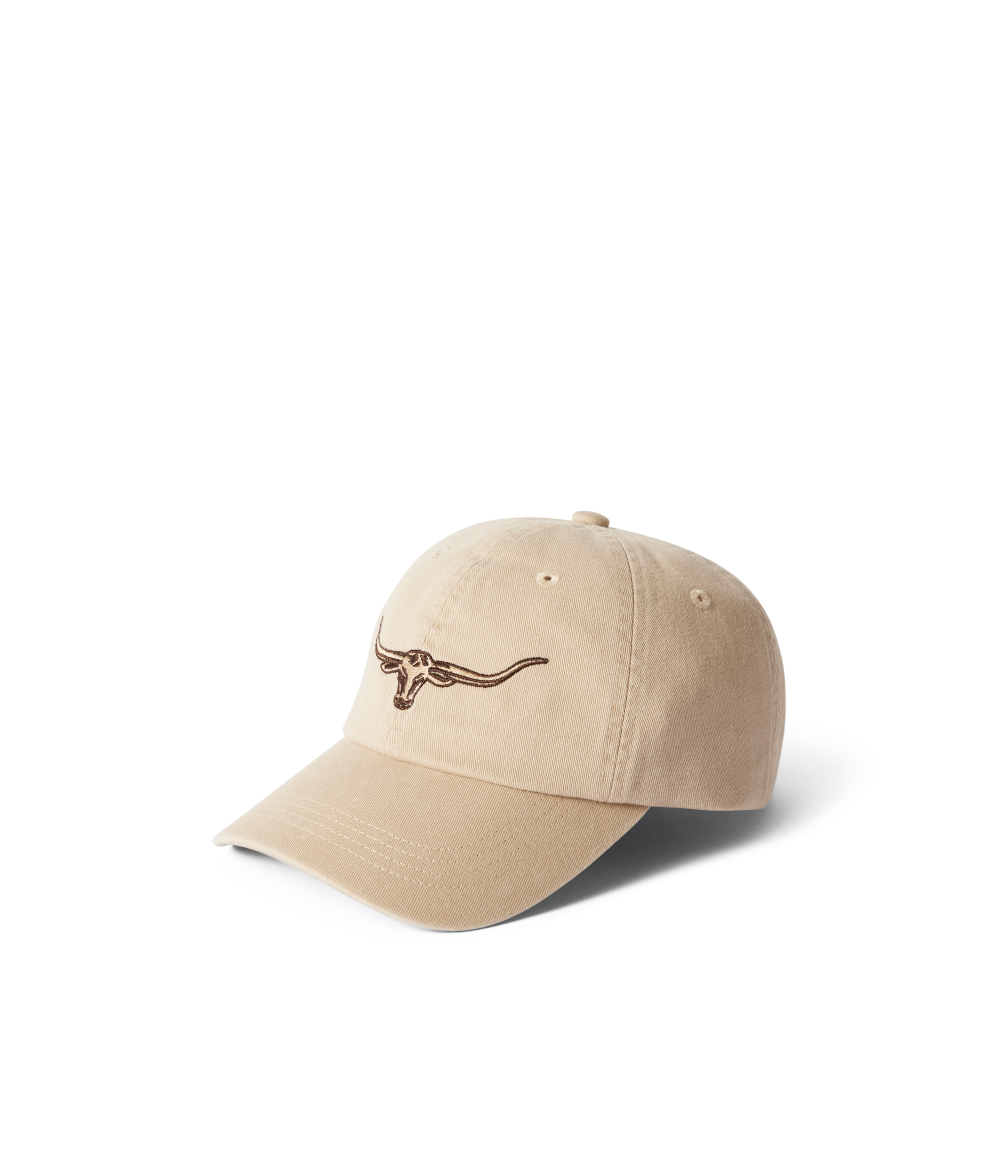 Crafted from 100% organic cotton twill, this cap features an embroidered Longhorn logo and an adjustable strap with a brass branded logo metal clasp.