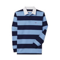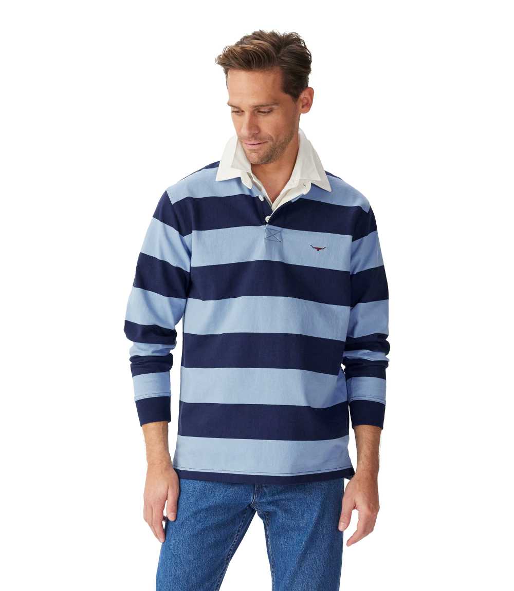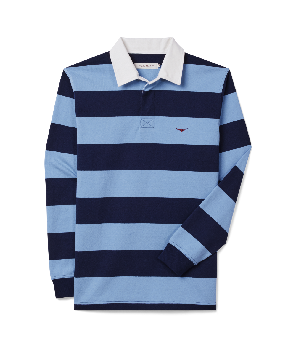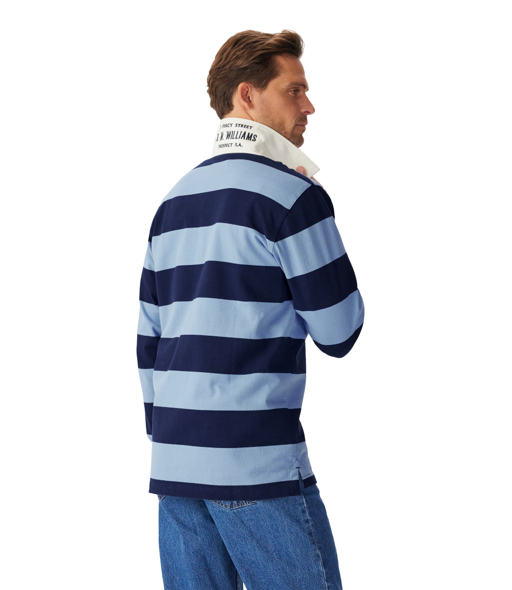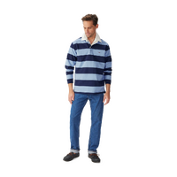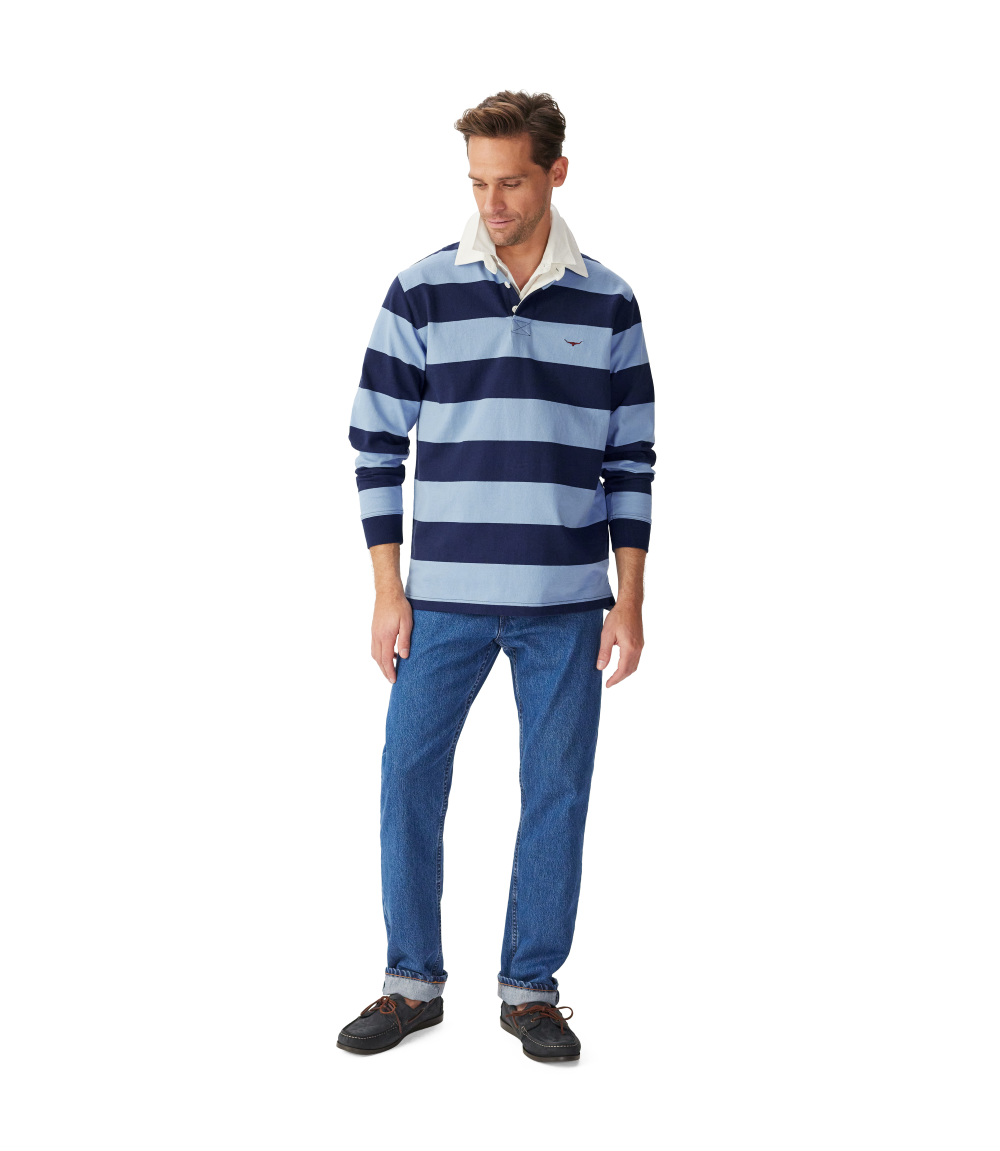 A refreshed rugby with seasonal stripes, crafted from oranic heavyweight brushed cotton, featuring a twill collar and two-button placket.