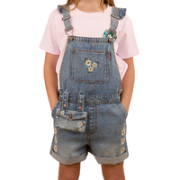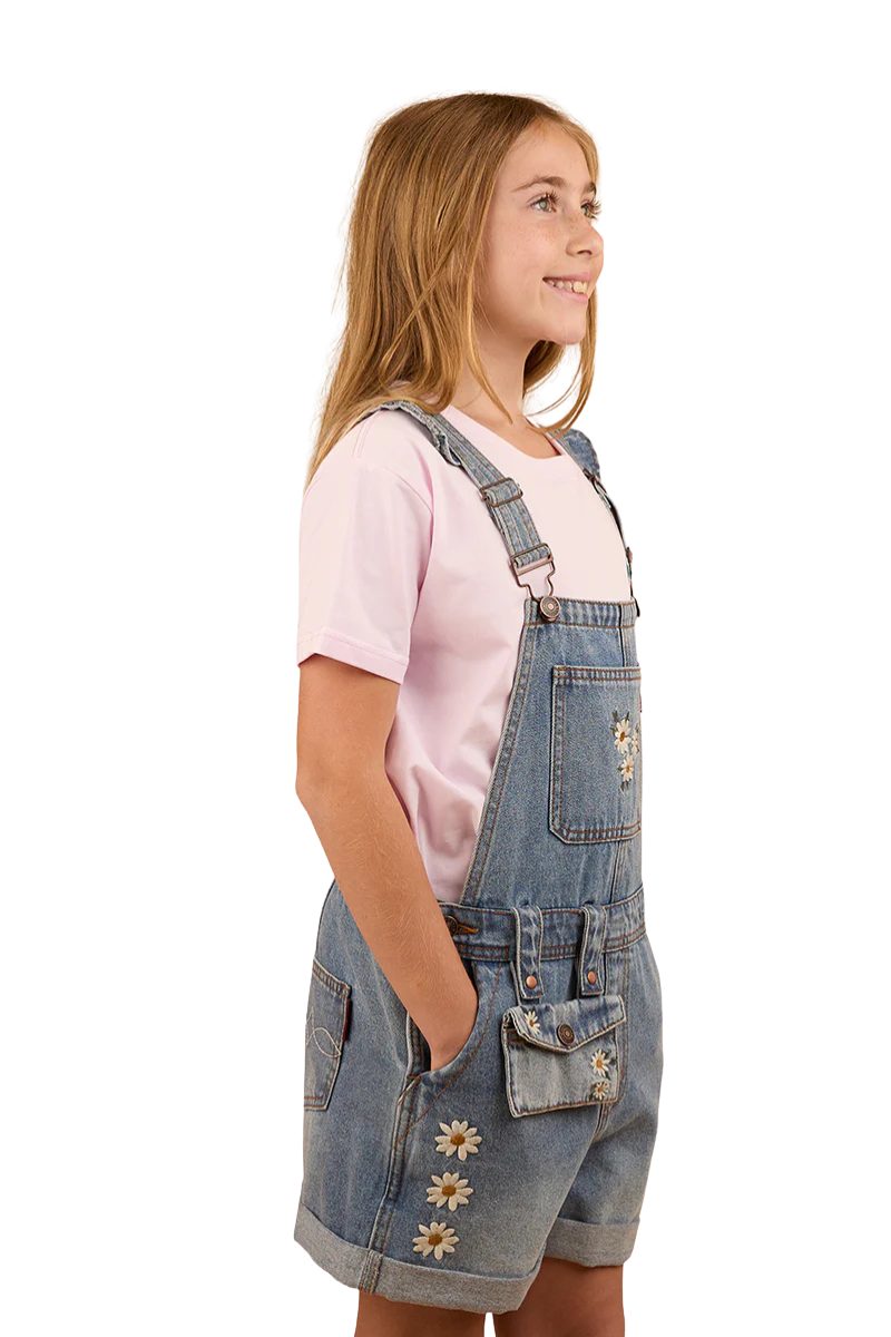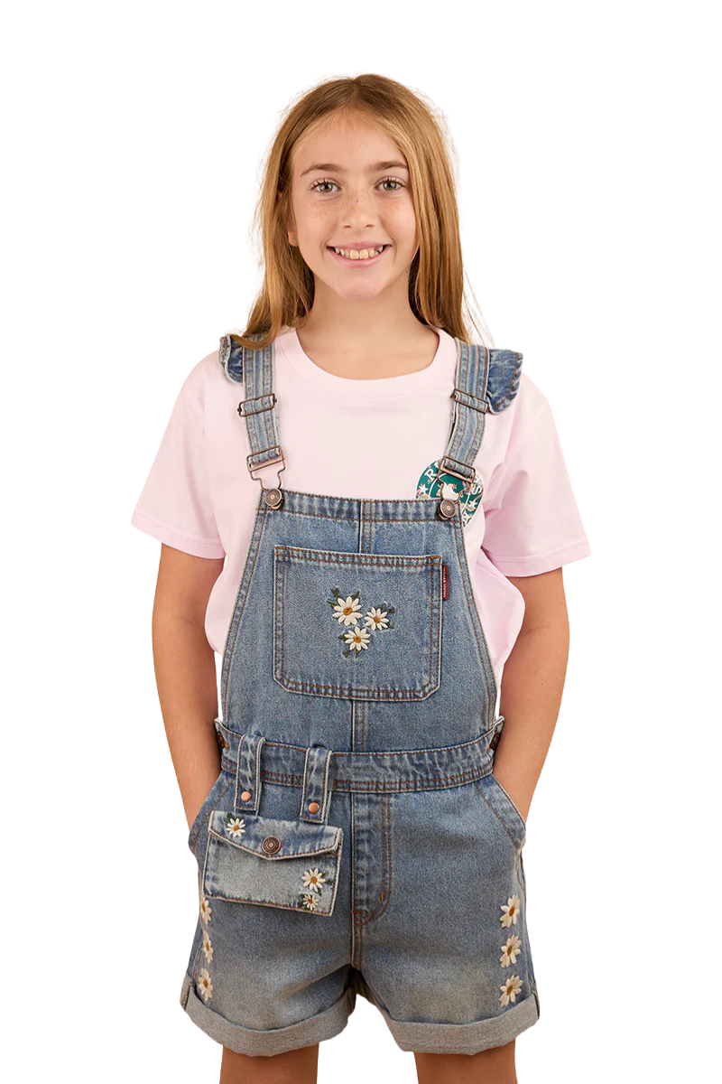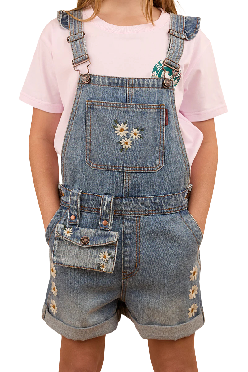 Cute and country, the Bessie Kids Denim Short Overall is the quintessential blend of comfort and style. Created from rigid denim, the Bessie offers a structured fit whilst maintaining comfort and breathability. The relaxed fitting overall style is current yet traditionally charming. Adjustable shoulder straps featuring a frill detail cater to a customisable fit, allowing this style to grow with your little one. The functional coin purse is sure to make even the littlest of cowgirls feel all grown up, whilst multiple storage pockets are the perfect hiding spots for special keepsakes and treasures. Signature daisy embroideries feature throughout the Bessies, a playful and fun finish to a summer style essential.