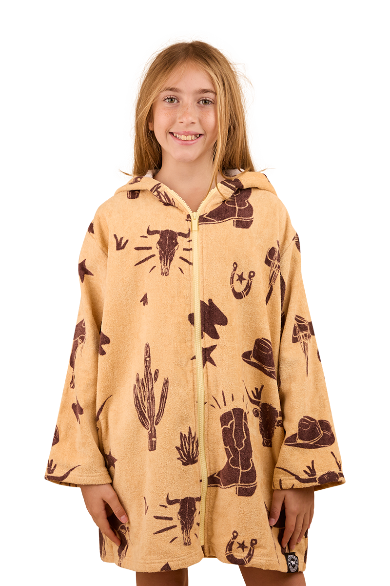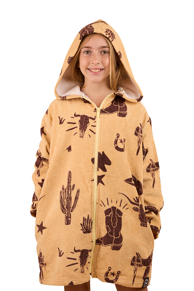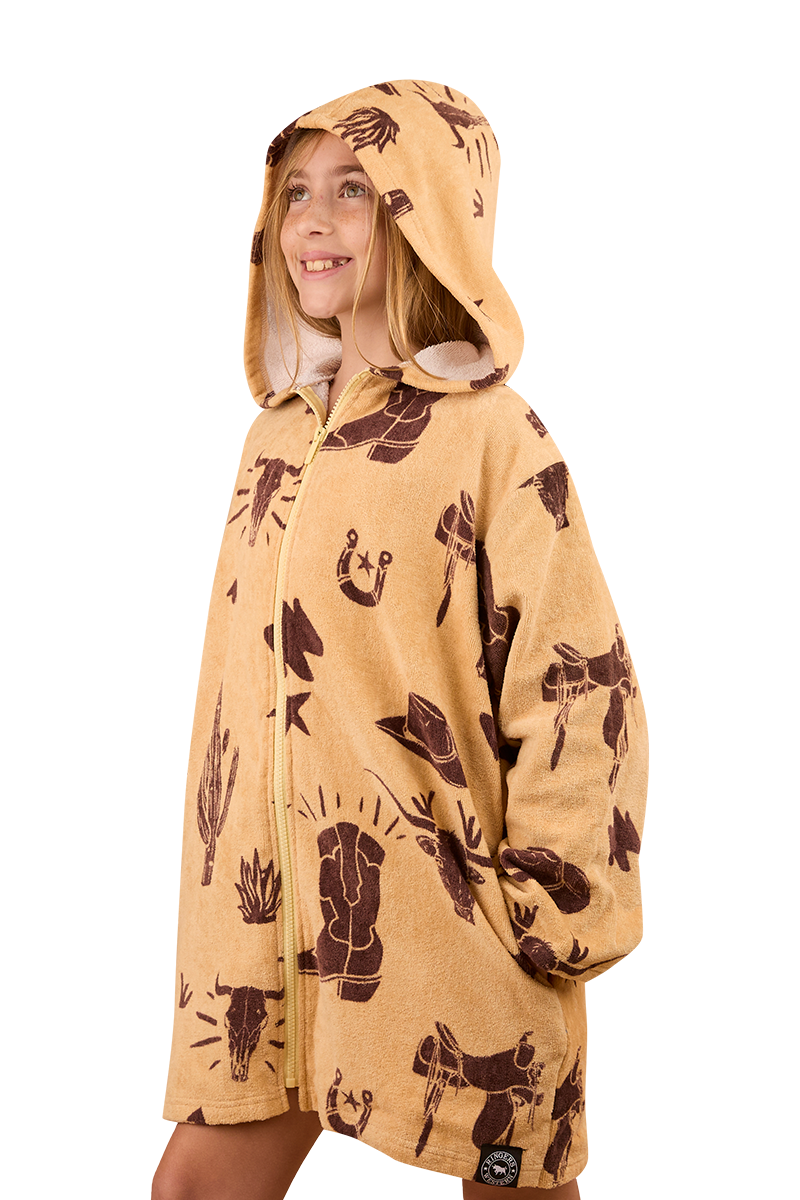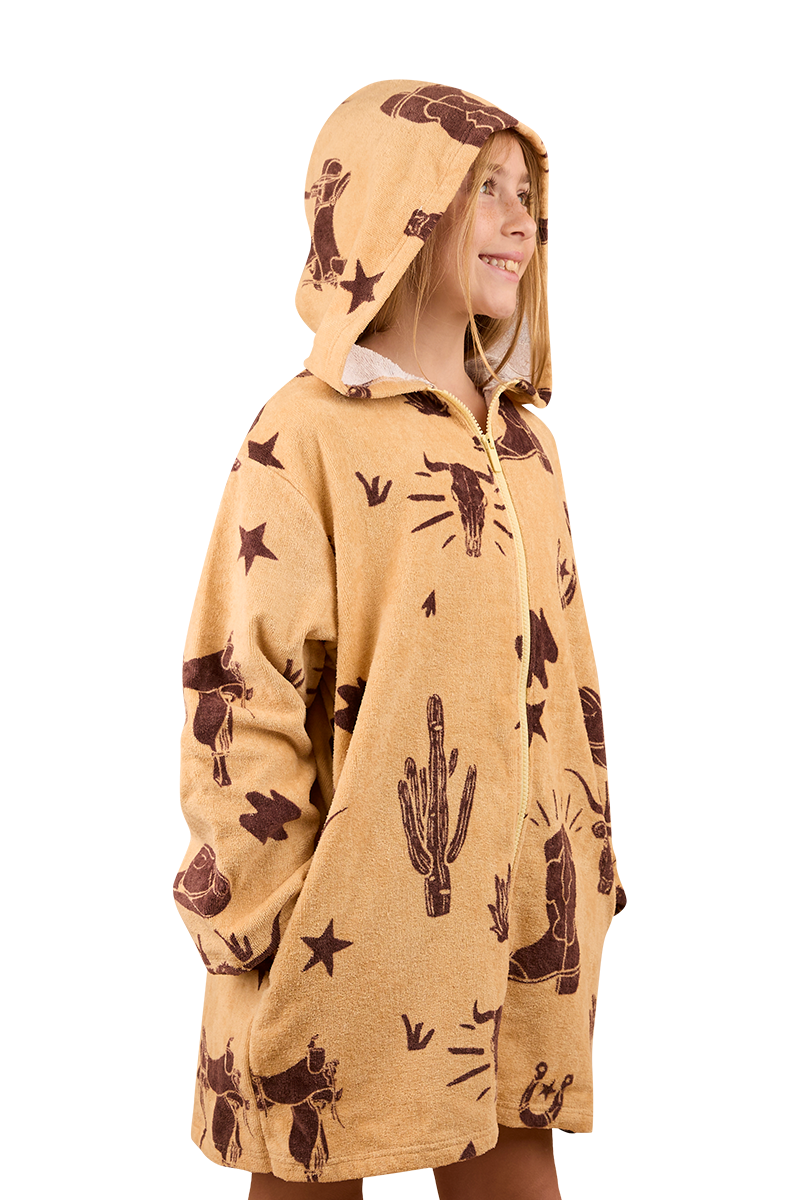 Thoughtfully created from a luxurious blend of plush cotton velour, this handy towel offers warmth and comfort whilst being highly absorbent. The zip-through, hooded design is practical and functional, allowing for easy wearing whilst on the move - perfect for rugging up after a day at the beach or heading home from swimming lessons. An all-over Western inspired print adds a playful, country touch that is sure to make drying off the best part of any aqua adventure.