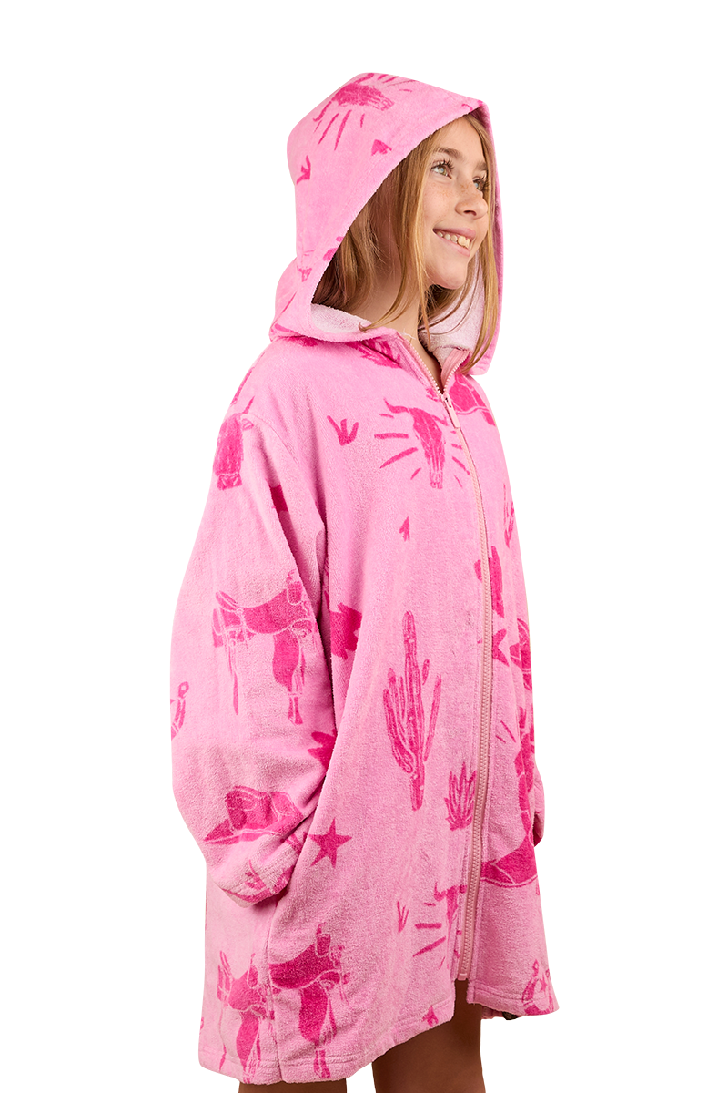 Thoughtfully created from a luxurious blend of plush cotton velour, this handy towel offers warmth and comfort whilst being highly absorbent. The zip-through, hooded design is practical and functional, allowing for easy wearing whilst on the move - perfect for rugging up after a day at the beach or heading home from swimming lessons. An all-over Western inspired print adds a playful, country touch that is sure to make drying off the best part of any aqua adventure.