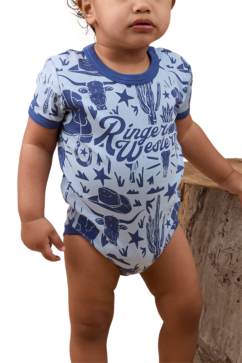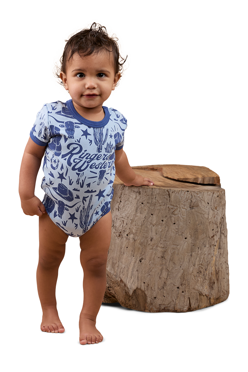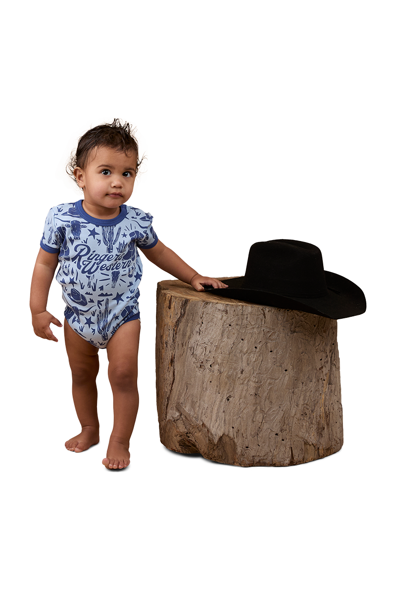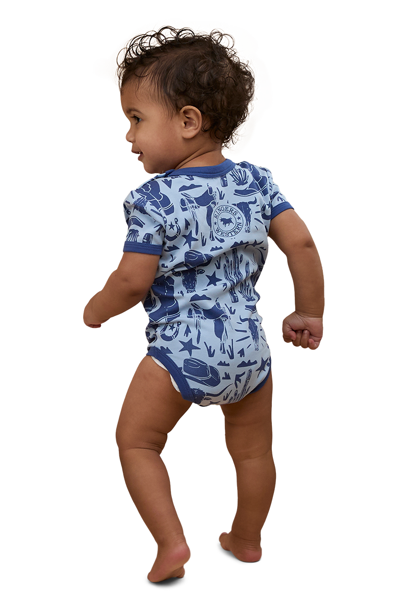 The Boot Scootin Babies Short Sleeve Romper has been thoughtfully created from 100% premium cotton, a fabric praised for it's superior breathability and softness - perfect against babies delicate skin. This delightful romper features snap button closures at the shoulder and crotch, making unexpected outfit and nappy changes a breeze. The relaxed fitting style features a signature Ringers Western allover yardage print, a fun and lively celebration of the wild west that is perfectly complemented by contrast binding. Get bub rodeo ready with the Boot Scootin Babies Short Sleeve Romper, a sweet and comfortable addition to every mini cowboy and cowgirls collection.