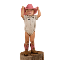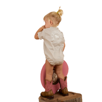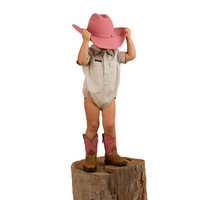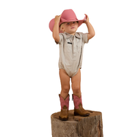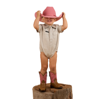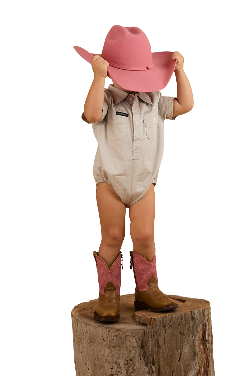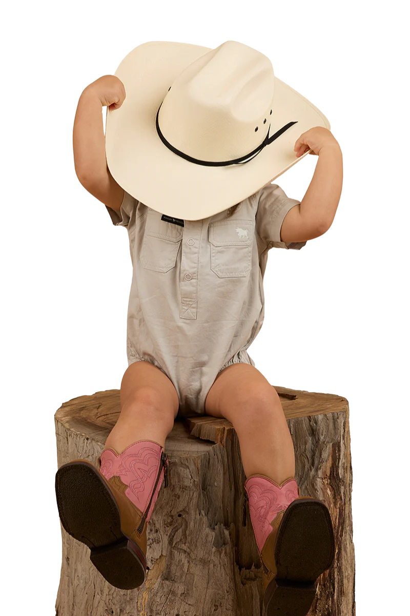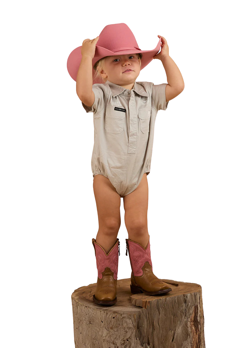 The Ringers Babies Short Sleeve Work Shirt Romper is created from 100% premium cotton, this fabric has a super soft handfeel and offers fantastic comfort and breathability - which is so important for the little ones in our warm, humid climate. A tribute to Ringers' classic work shirt design, this romper features mock dual chest pockets as well as their Signature logo on the back. A handy snap button closure makes changes a breeze, making this little romper a convenient and stylish choice for bub at your next rodeo!