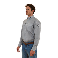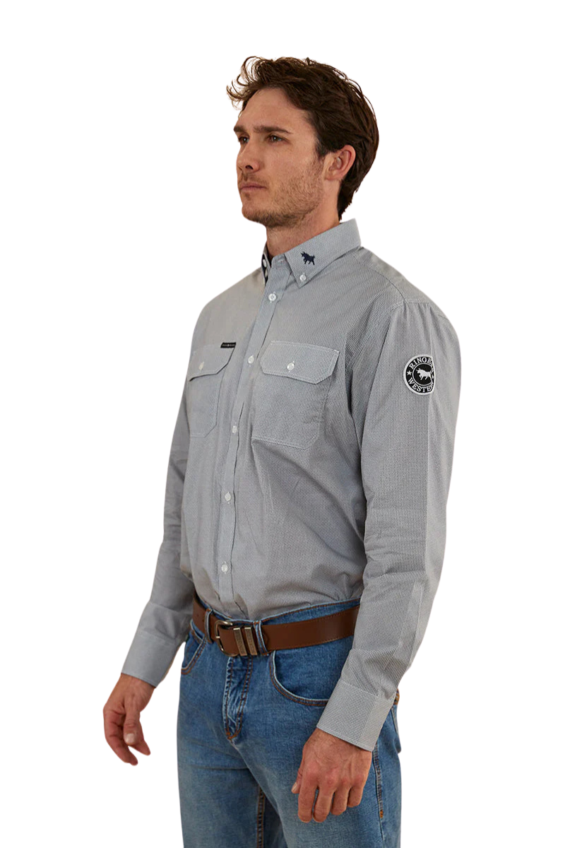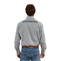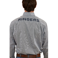 Shelton is the perfect PBR number. This semi-fitting dress shirt is the perfect blend of tradition and modern western wear. The Ringers Western semi-fit dress shirts closely follow the natural shape of your body without feeling too snug or restrictive. Crafted from a premium blend of cotton, nylon, and a hint of spandex, this shirt offers a luxurious feel with a touch of stretch for unmatched comfort and mobility. The Shelton features multiple embroidered logos on the collar, wearers left arm and centre back yoke while the double chest pockets add both style and utility to your outfit. This dress shirt has our 'Cowboy' length which ensures you will never be left untucked - a tried and true staple.