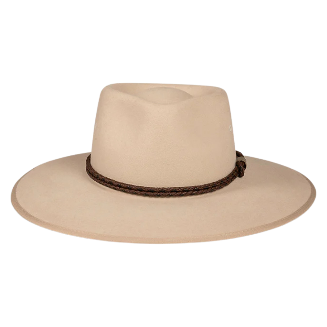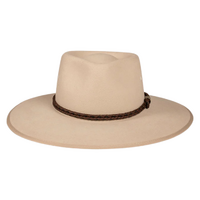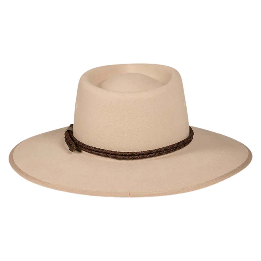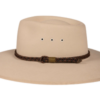The Minamurra hat is the perfect felt hat for everyday wear, crafted from premium quality felt and shaped with an outback style. This hat features a braided faux leather hat band around the base of the crown and an internal leather sweatband for a sleek fit. Finished off nicely with an antique brass metal logo, the Minamurra is a popular choice for those seeking both style and functionality in their headwear.