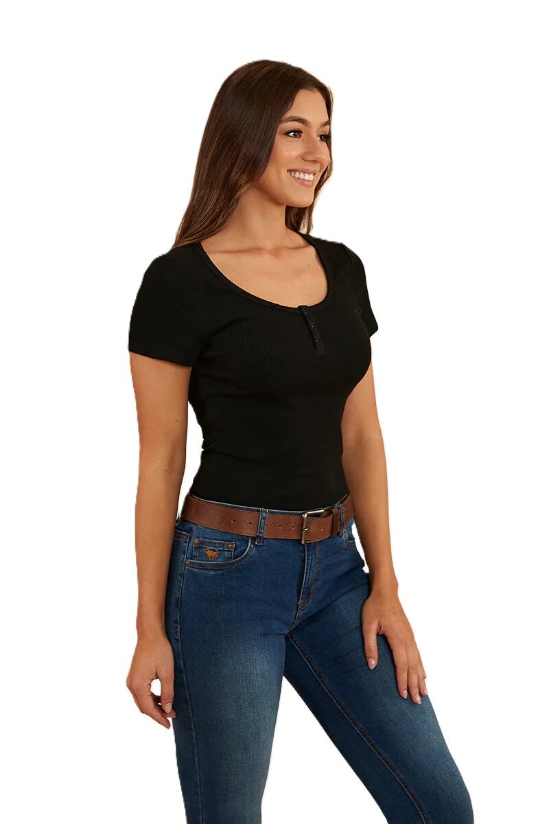 This Arabella ribbed t-shirt is a stylish and functional piece of clothing that offers a contoured, yet comfortable fit all day long. This t-shirt is made from a two-way stretch cotton blend which offers a soft feel against the skin and is breathable and non-restrictive. Arabella features a three-button centre-front packet which can be worn fastened or left open, a small Ringers Western embroidered bull on the front chest and a branded metal badge on the back neck.
