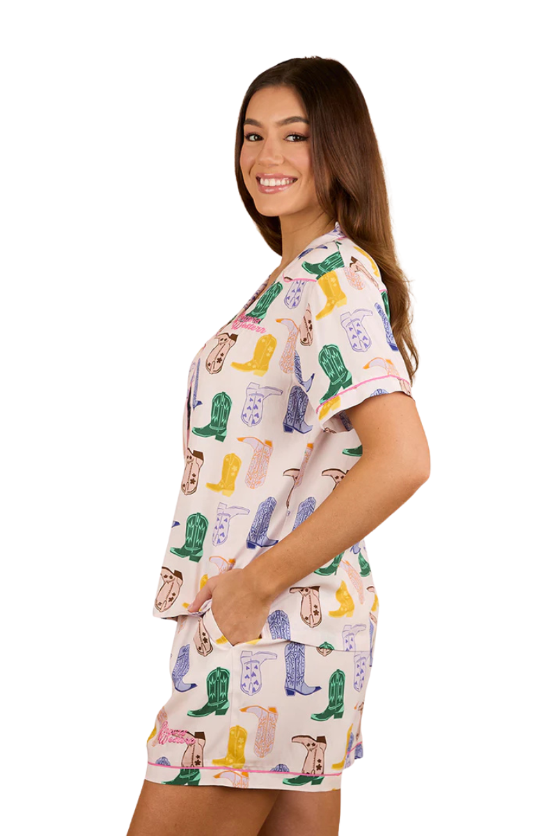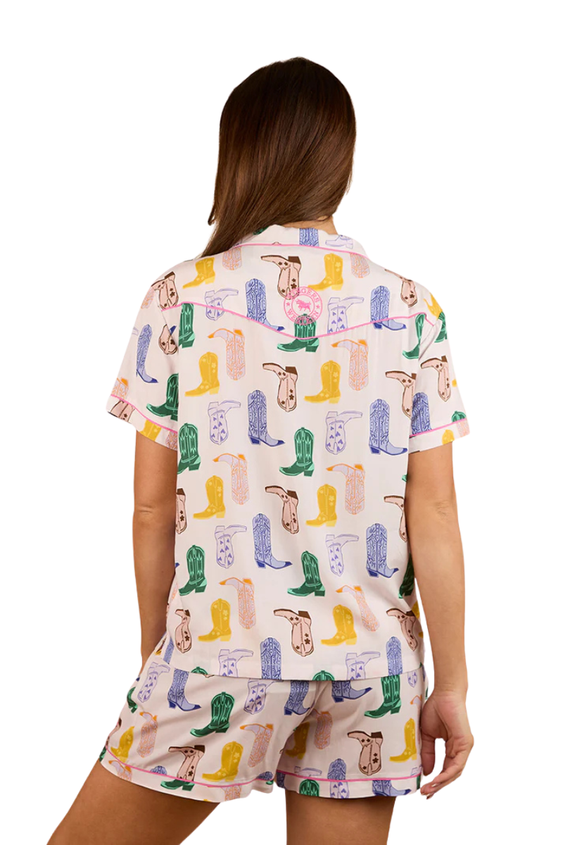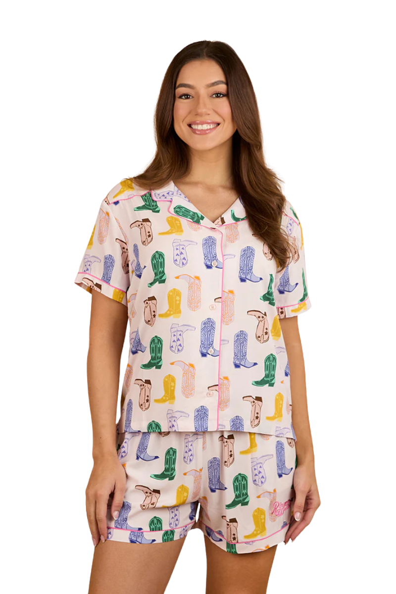 Designed with a relaxed fit for ultimate comfort, the Bianca set features a full button-down front, making it easy to wear and layer. The elasticated waistband ensures a flexible and flattering fit, while the western yoke details and contrast piping add a charming touch of country flair. A playful all-over Ringers Western yardage print brings a unique look to your bedtime routine.