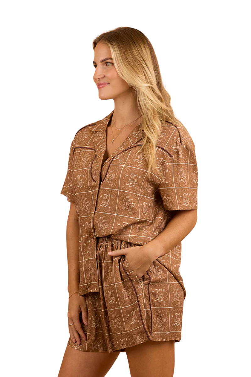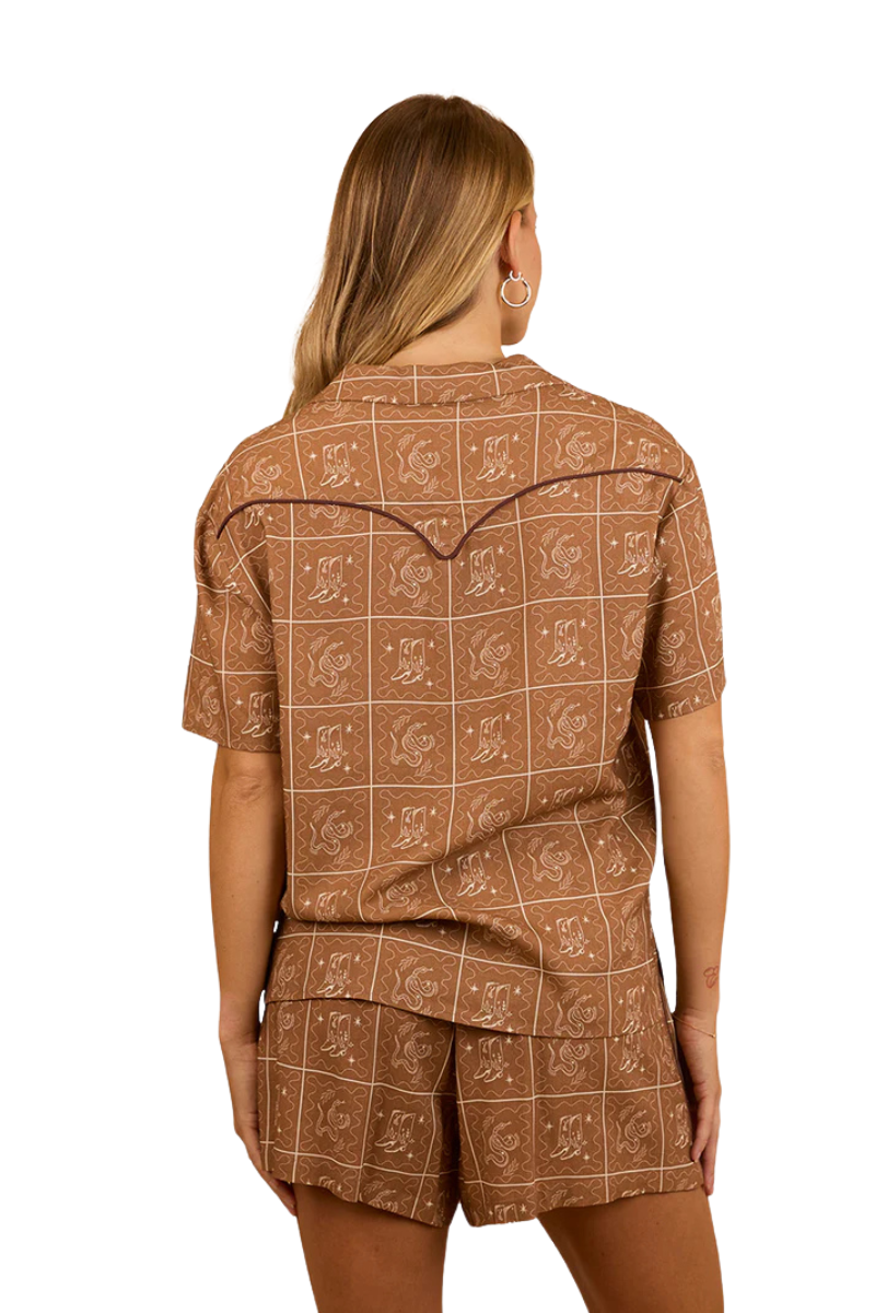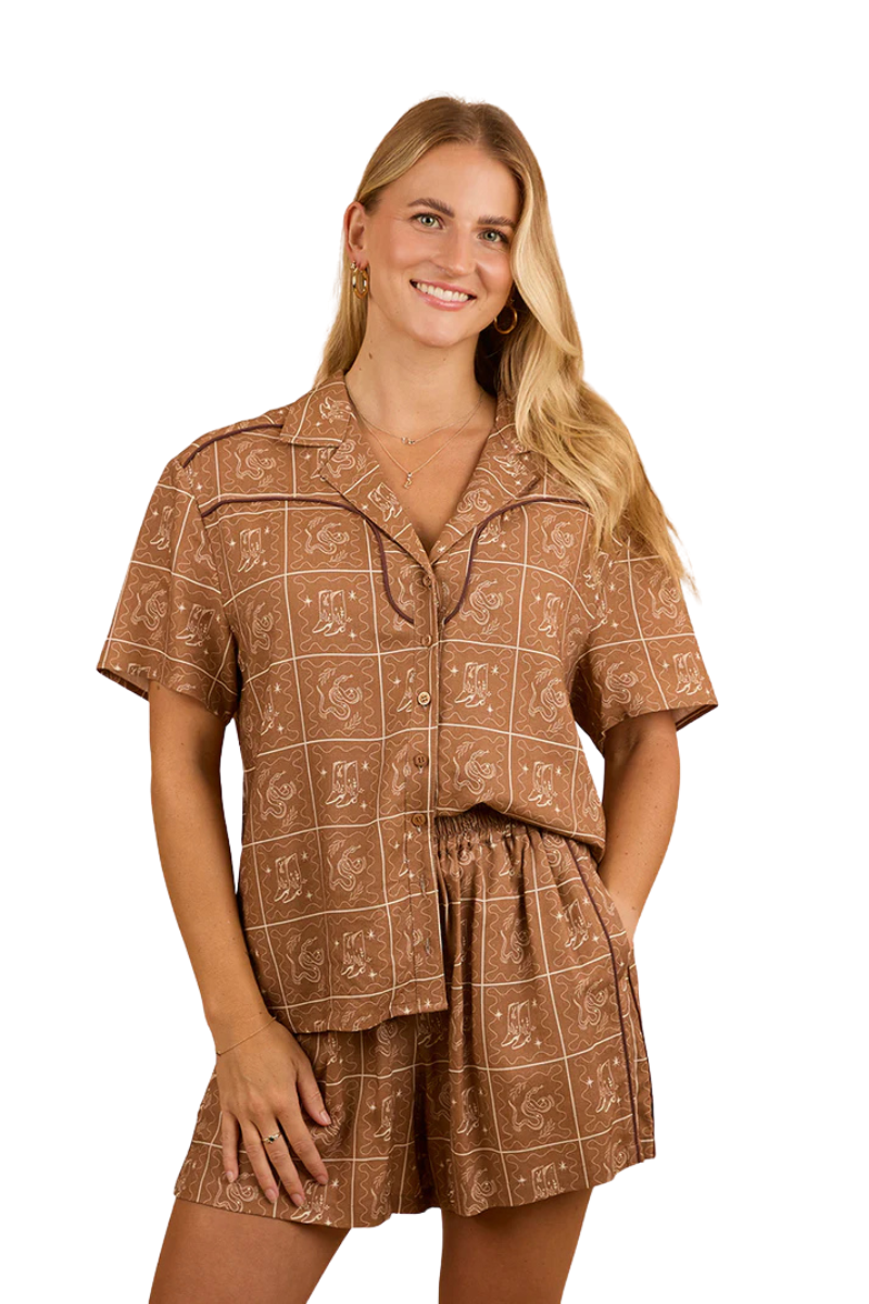 The Cody Women's Shirt is a must-have for the fashion forward cowgirl. Created from a rayon and linen blend, this modern summer shirt offers comfort and breathability whilst being easy to care for. The Cody shirt can be worn as a set or can be styled with your favourite denim, either buttoned up or left unbuttoned over the top of a simple white tank for an effortlessly put together ensemble. The neutral colour palette features an allover western print, whilst contrasting piping borders the western style yoke panels - adding just the right amount of western chic.