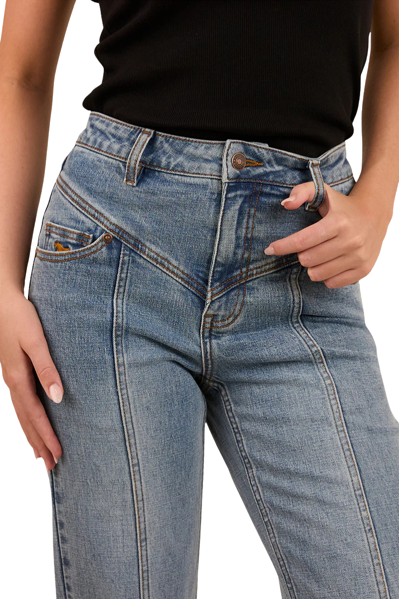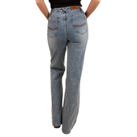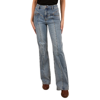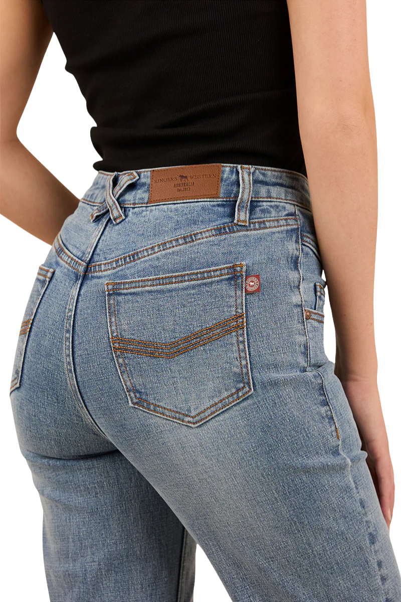 These high rise denim jeans offer superior comfort and breathability, moving with your body whilst providing structure and maintaining shape. The bootleg design elongates the legs, fitting through the hips and seat before gently tapering off at the knees - making the Edith’s perfect to pair with your favourite boots for a stylish and flattering ensemble that will take you anywhere. The V-front yoke panel and front leg seams are standout features that perfectly capture true western style. Cross over belt loops feature on the back of the waist band adding some fun yet functional western flair, whilst signature back pocket stitching and woven labels complete the look with Ringers Western authenticity.