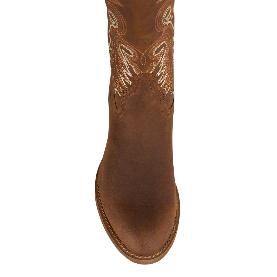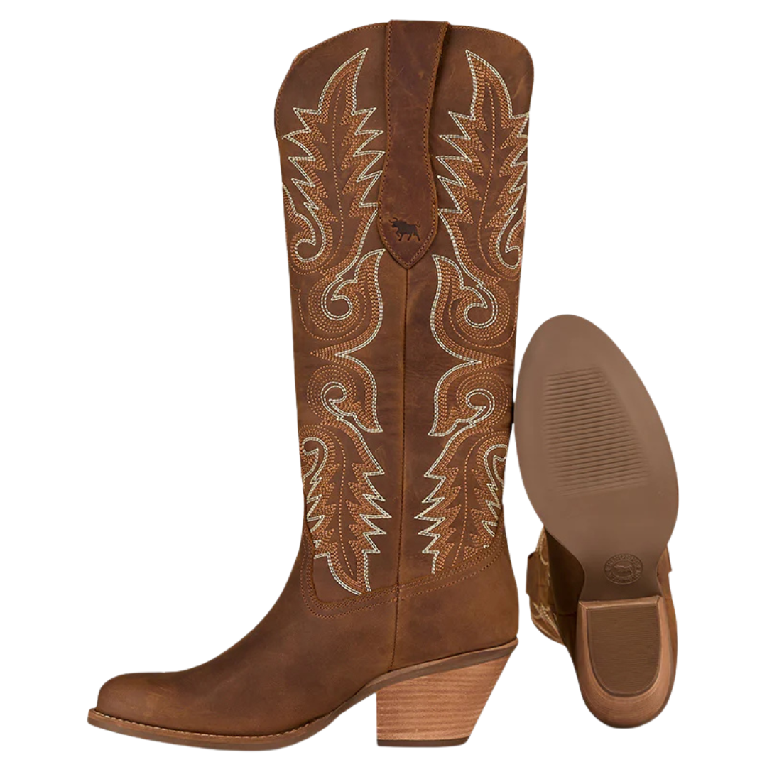 Featuring a fashion-forward 16" shaft with ornate two-tone Western embroidery, the Lainey Boot makes a standout statement whether you're dressing up for a night out or heading to a festival. The signature bull-logo pull tabs make them easy to slip on and off, while the 6cm cemented heel provides the perfect lift for all-day wear.