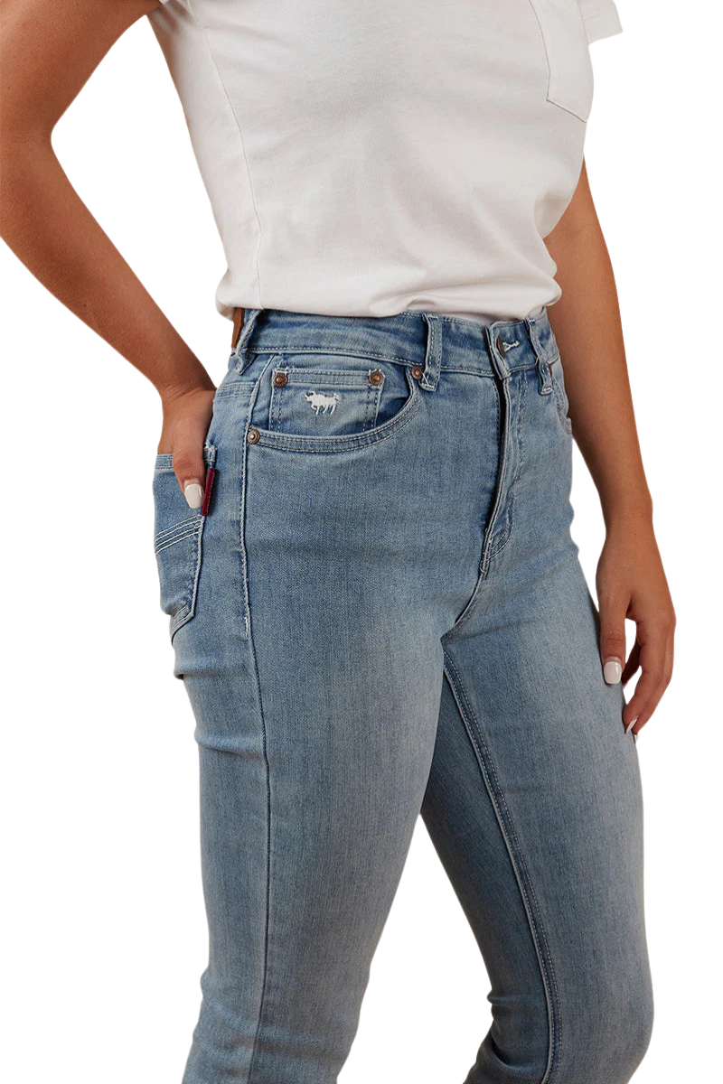Ringers Western high-rise jeans are designed to rest comfortably above the belly button with a snug fit from the waist through to the hips and thighs, contouring the natural curves of a woman's body. Hugging the thighs and making its way down to the knee where the bootleg shape begins to slightly flare out, creating our signature bootleg shape. Made from a cotton blend, this material provides durability and breathability with a dash of elastane ensuring the jeans have a slight stretch for a more comfortable fit. The elastane segment is quite minimal which helps to maintain the traditional stiff feel of western denim. Featuring a traditional five-pocket design, a small Ringers Western bull embroidery on the coin pocket and a centre front zip closure for easy wearing. These high-rise favourites are the perfect riding jean because of their higher waist, no shirt will be left untucked from this little number.