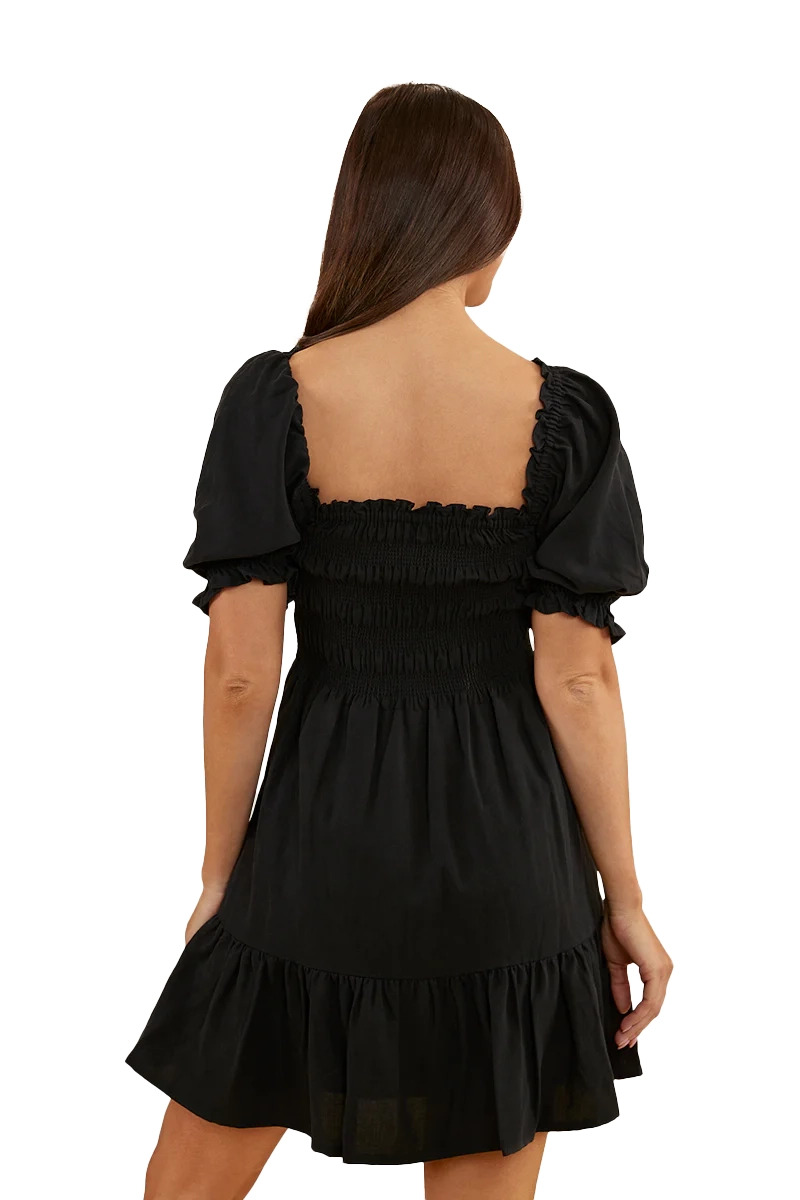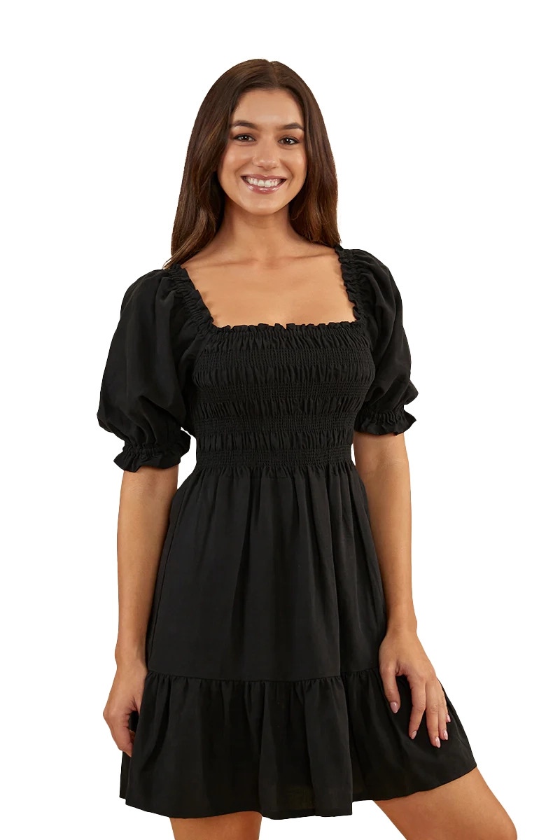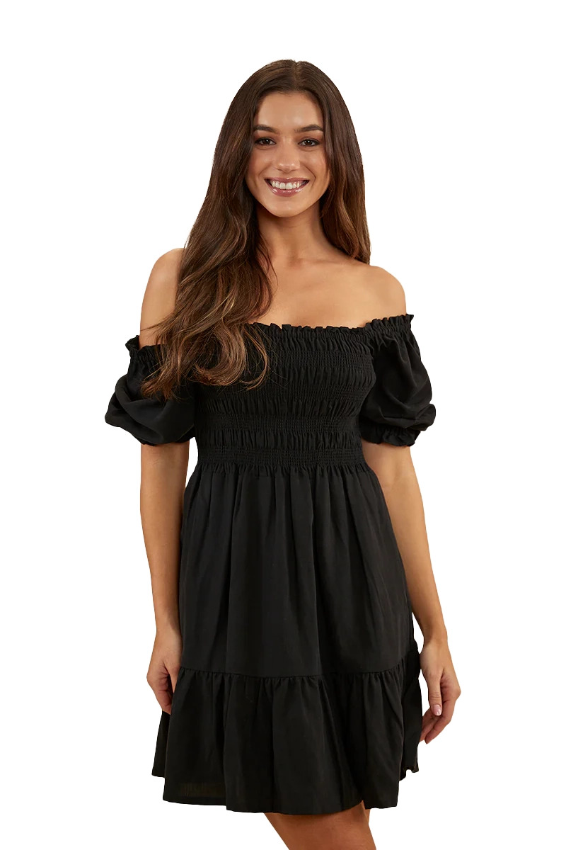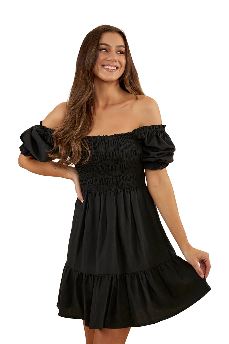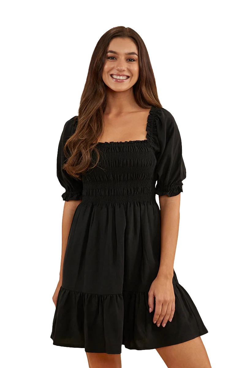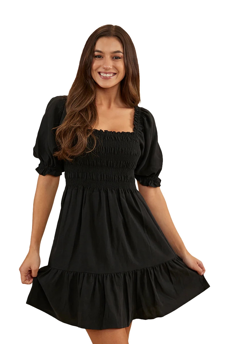 A sweet, charming, country number, Ringers' Tahlia is the perfect Little Black Dress. (If you're looking for the perfect summer dress, find it here.) Alluring and sweet all at once, the Tahlia mini dress features an intricate shirred bust panel and elasticated sleeves which can be worn on or off the shoulders. The flowing feel and the mini length give it a fun, flirtatious edge. Whether you're headed to dinner, a barn dance, or a sunny day out, Tahlia will be your perfect companion. Go classic country with the shoulders on and some cowboy boots, then step it up with the shoulders off and some strappy heels for your dinner date. Perfect!