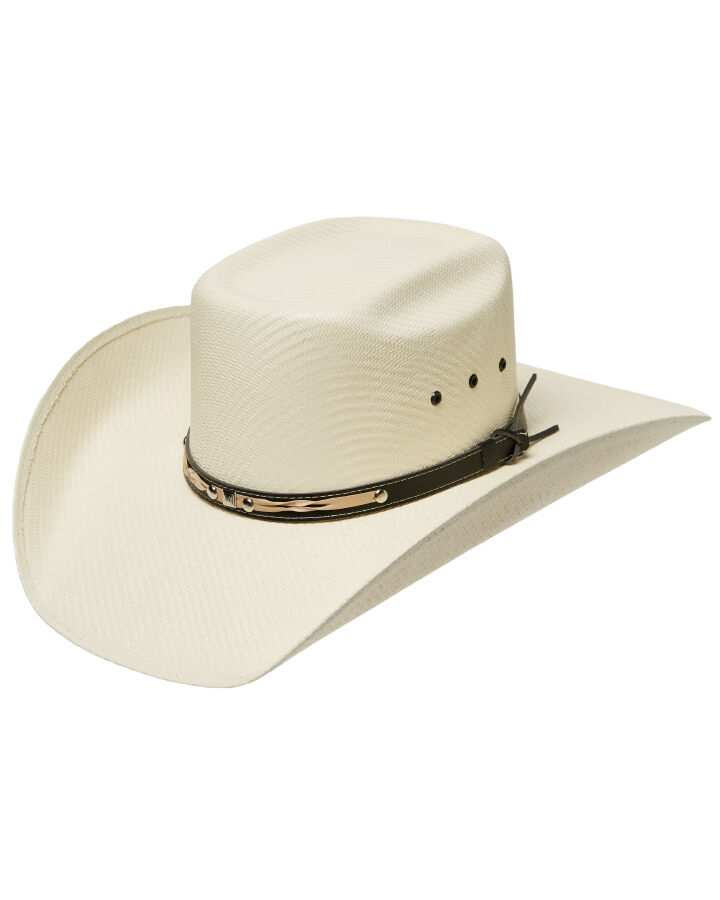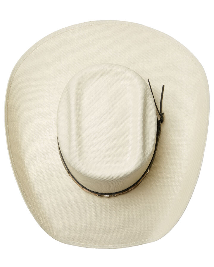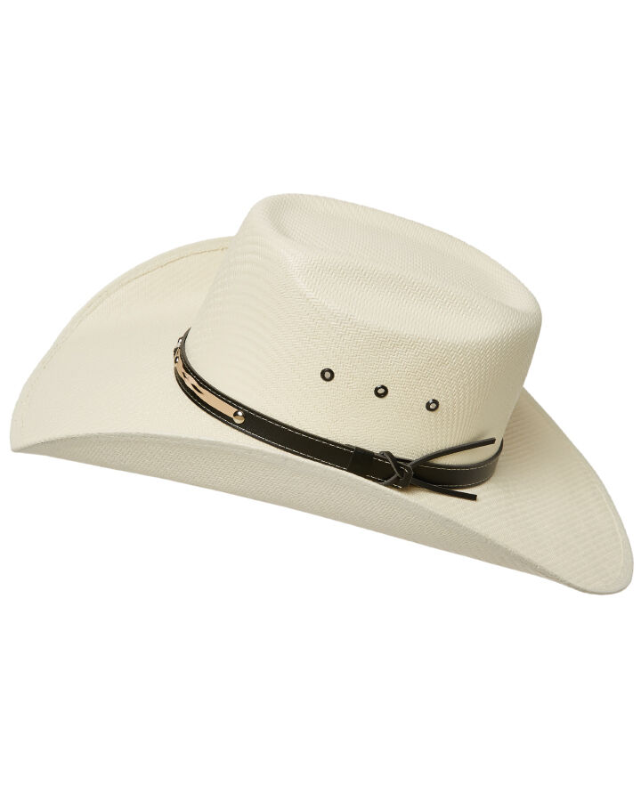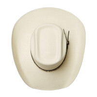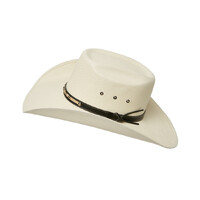 Kick up the dust with the Statesman Cuernos Chuecos Straw Hat. Built tough for long days under the sun, this straw beauty features a rich brown leather hatband with light brown detailing for that extra bit of class. With three eyelet vents on either side, it keeps your head cool even when the mercury climbs. The 12cm crown gives it a proud, punchy profile, while the wide 11cm brim offers solid shade where it counts
