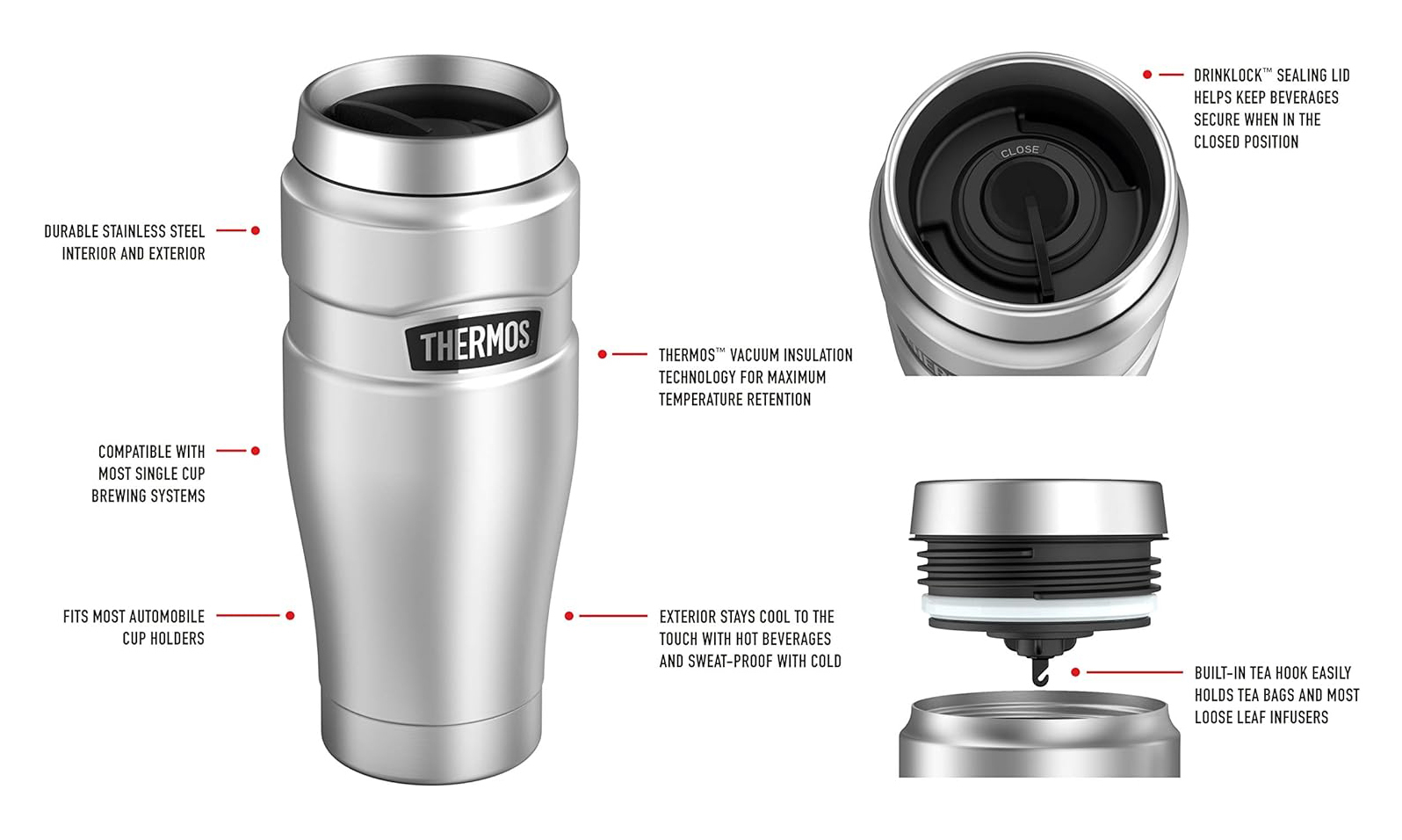 - Thermos™ vacuum insulation technology for maximum temperature retention, hot or cold