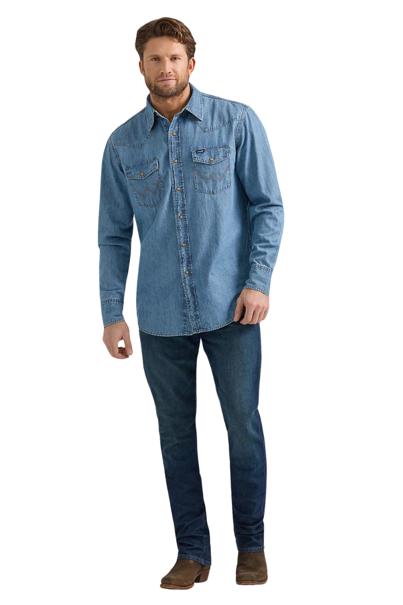When you need to layer up, the Men's Wrangler® Classic Denim Western Snap Shirt has you covered. It’s crafted from cotton for comfort and lasting quality. And the classic fit will seem as if it was made just for you. This long-sleeve collared shirt comes with all the heritage-inspired details you know and love—one point front and back yokes, snap flap chest pockets with the ‘W’ stitching, a snap closure, and a classic fit that’s easy to dress up or down.