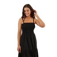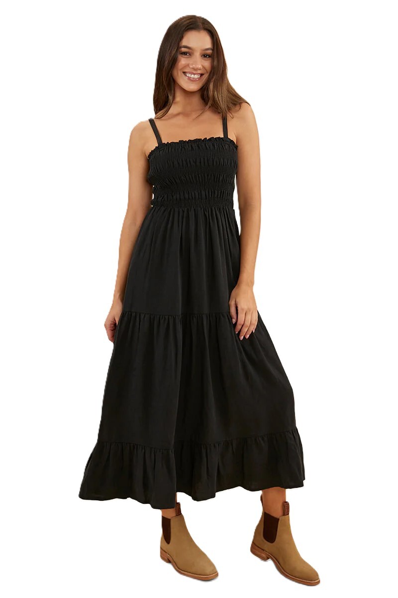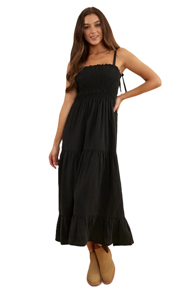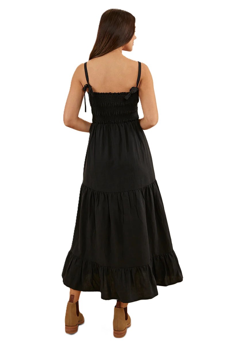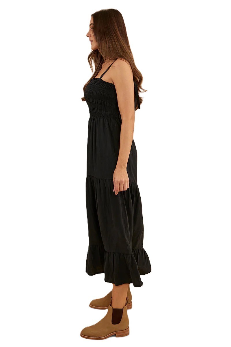 Rosabel captures the essence of vintage charm. It has a shirred bodice that hugs your frame, with a flowing maxi skirt of EcoVero rayon falling effortlessly to a sweeping statement of grace and sophistication. Yes. It is impressive, and it feels carefree. Enjoy!