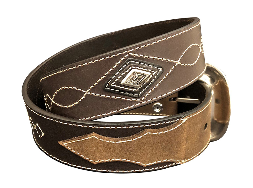 This bridle leather western belt features contrasting stitching and overlays.