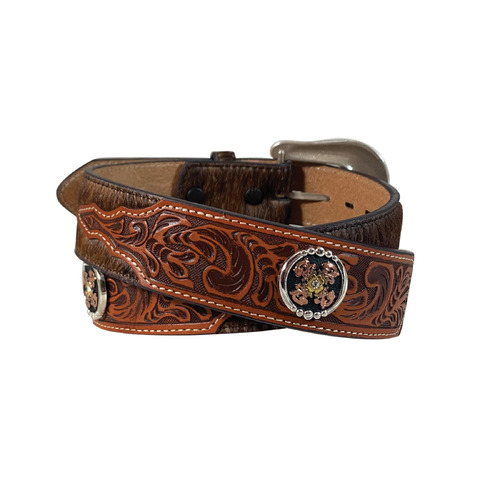 A beautifully detailed, tooled leather belt with hair-on-leather detail.