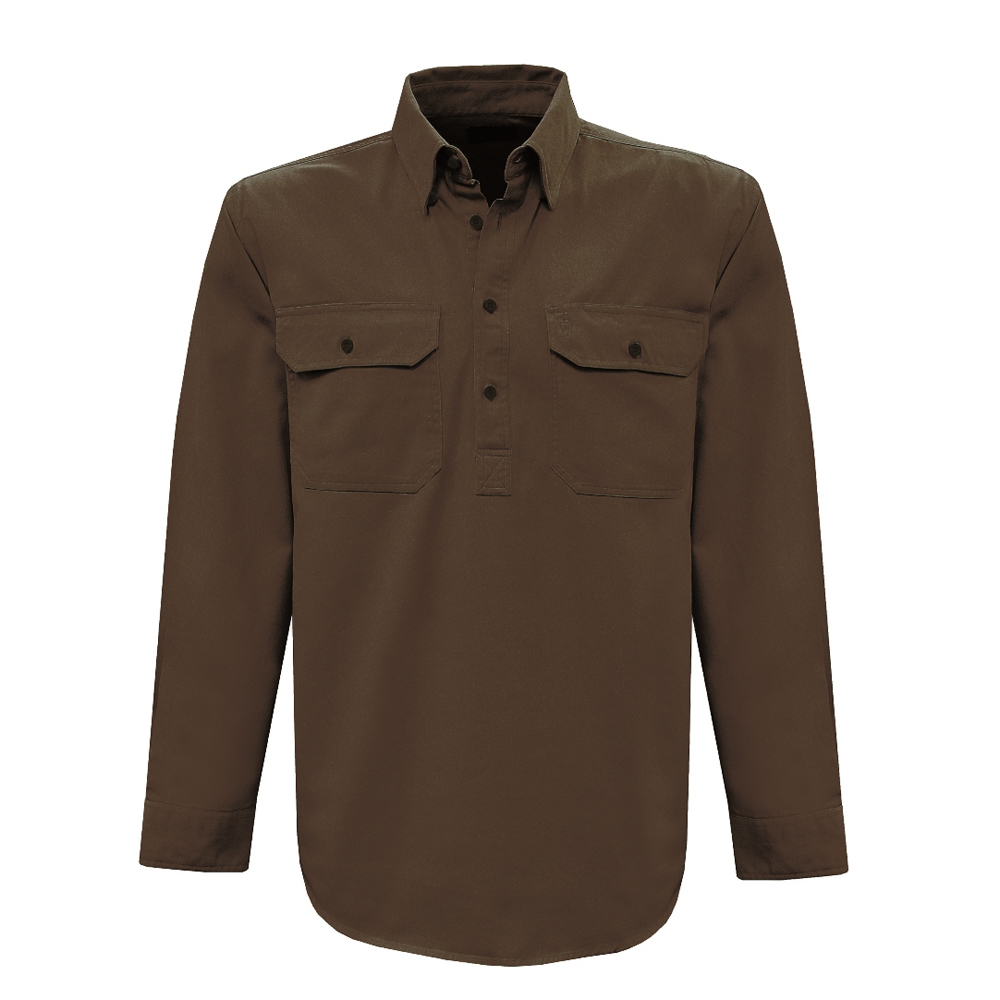 A classic work shirt, the half button is a much loved alternative to a full button shirt for country people, workers and tradies all over Australia. They're easy on/off (less buttons) and safer because there are no shirt-tails to get caught in machinery or on fences!