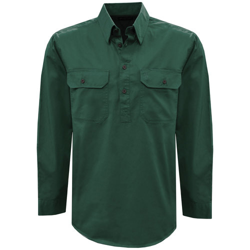 A classic work shirt, the half button is a much loved alternative to a full button shirt for country people, workers and tradies all over Australia. They're easy on/off (less buttons) and safer because there are no shirt-tails to get caught in machinery or on fences!