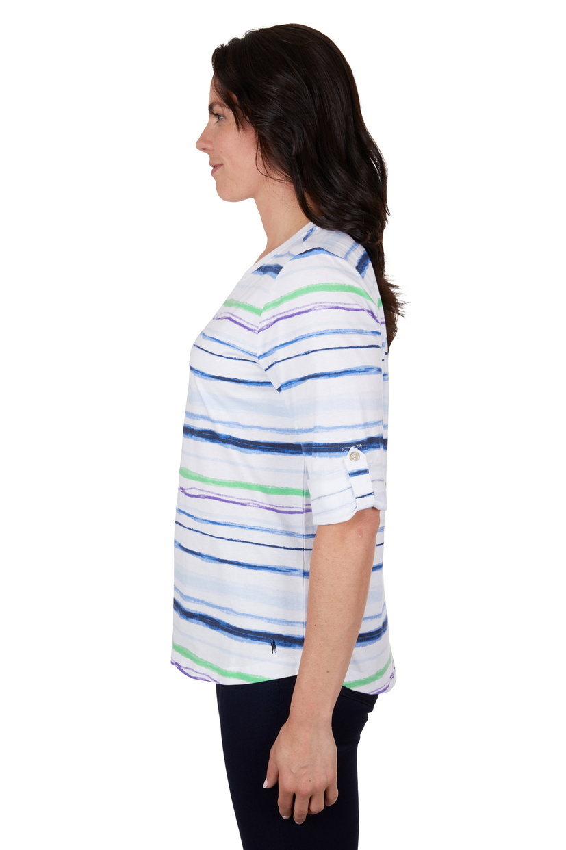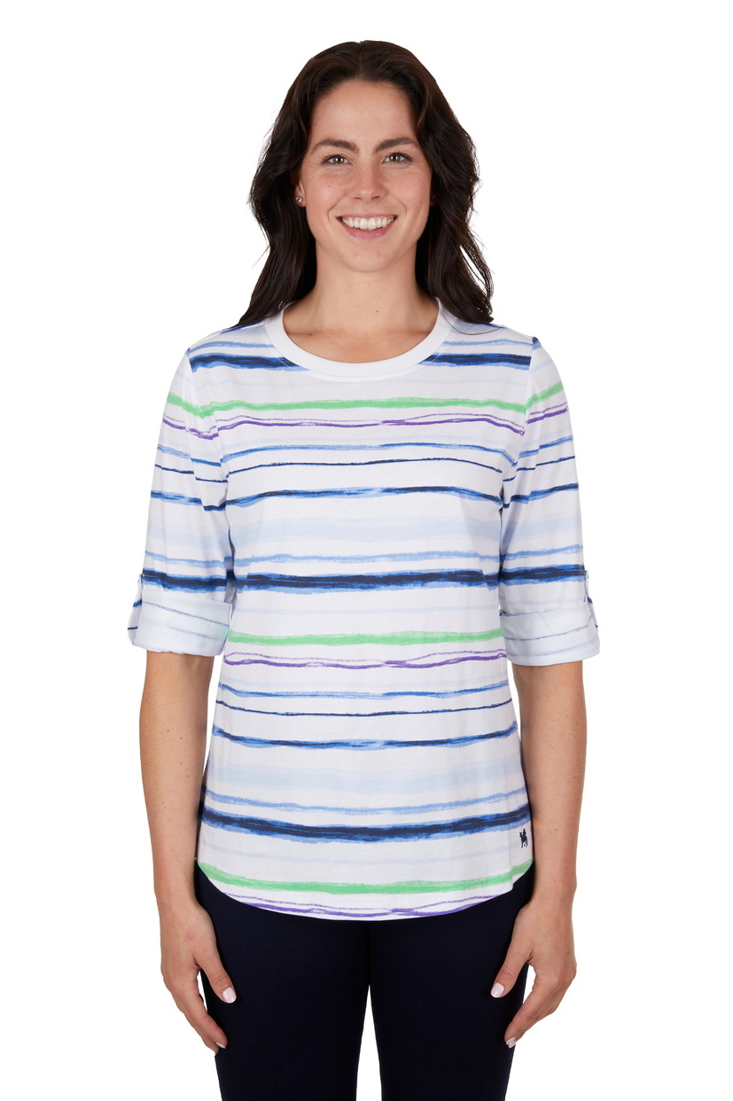 The Thomas Cook Nadia 3/4 Sleeve Tee is that perfect in between option, with its soft cotton jersey and printed stripe design. The ribbed neckline and 3/4 roll-up sleeves with tabs provide a modern touch, while the curved hem ensures a flattering fit. Finished with the Horseman embroidery on the side hem, this 100% cotton tee is perfect for a casual and comfortable look.