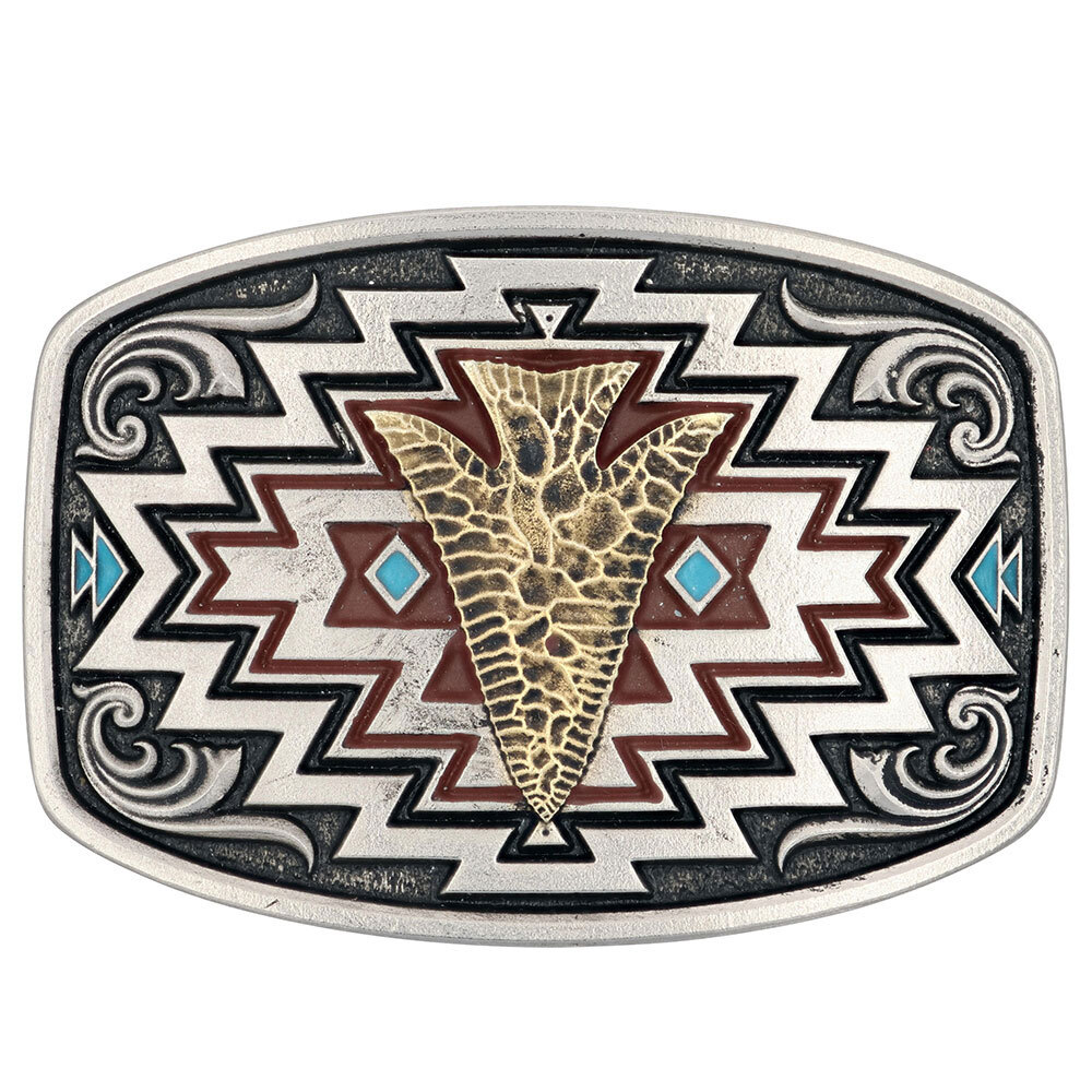 Montana Silversmith's Radiating Center of it All Arrow Belt Buckle is a curved, rectangular Attitude cast buckle that is hand-painted, radiating the centre gold-finished arrow design. The Aztec inspired geometric etched pattern is painted in reds and turquoise-blues.